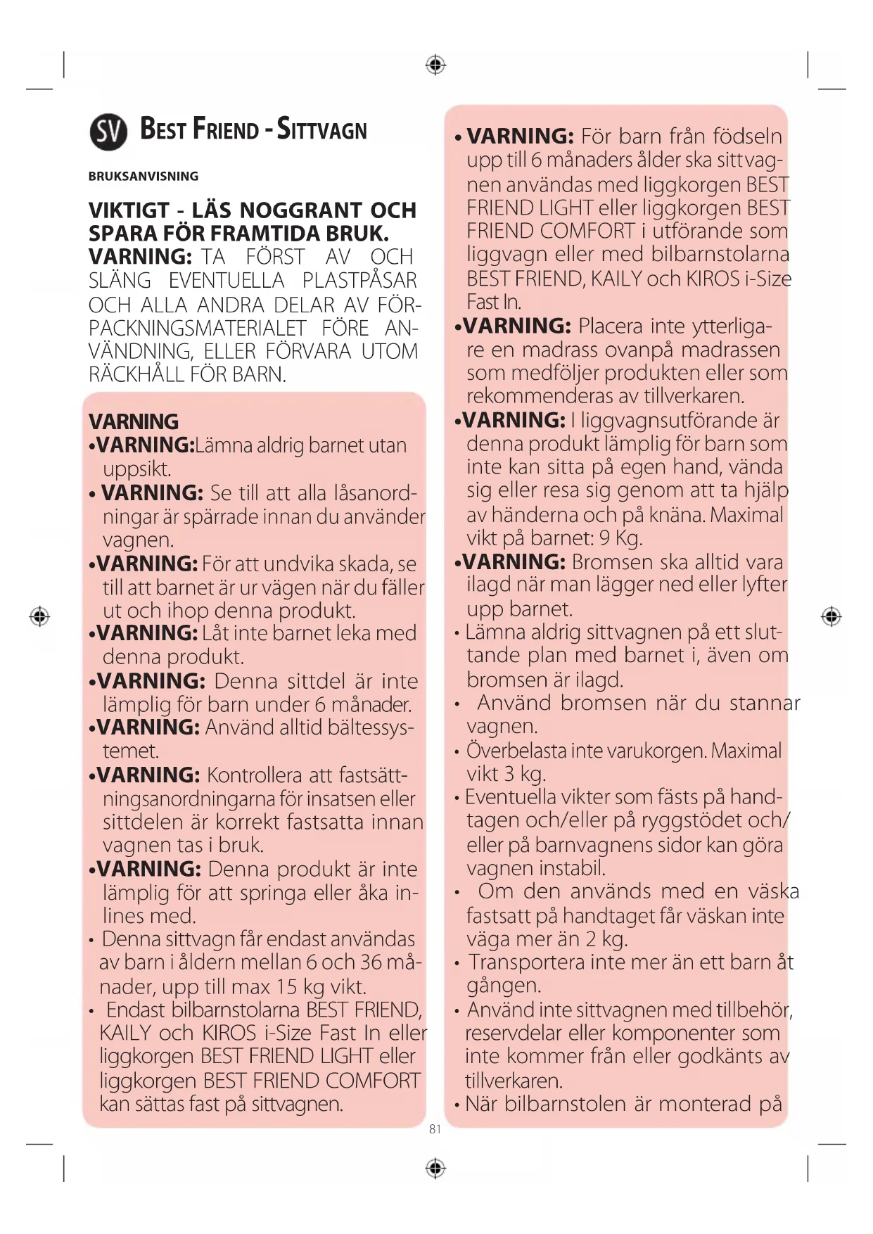 - VARNING: För barn från födseln upp till 6 månaders ålder ska sittvag- nen användas med liggkorgen BEST FRIEND LIGHT eller liggkorgen BEST FRIEND COMFORT i utförande som liggvagn eller med bilbarnstolarna BEST FRIEND, KAILY och KIROS i-Size Fast In.