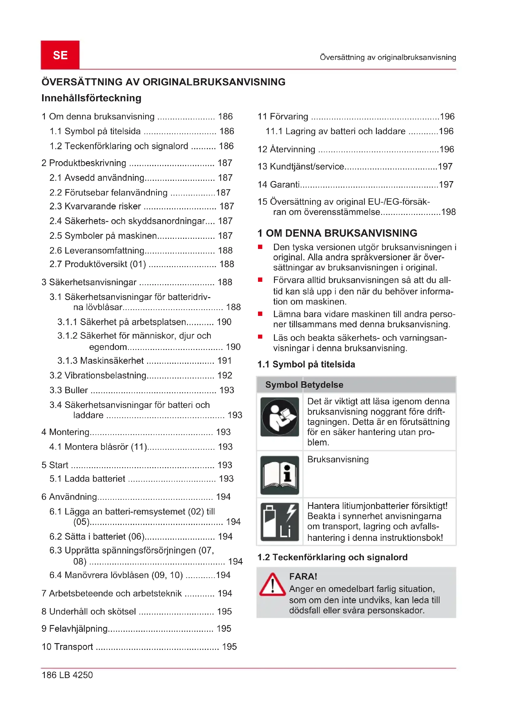 1.2 Teckenförklaring och signalord .......... 186