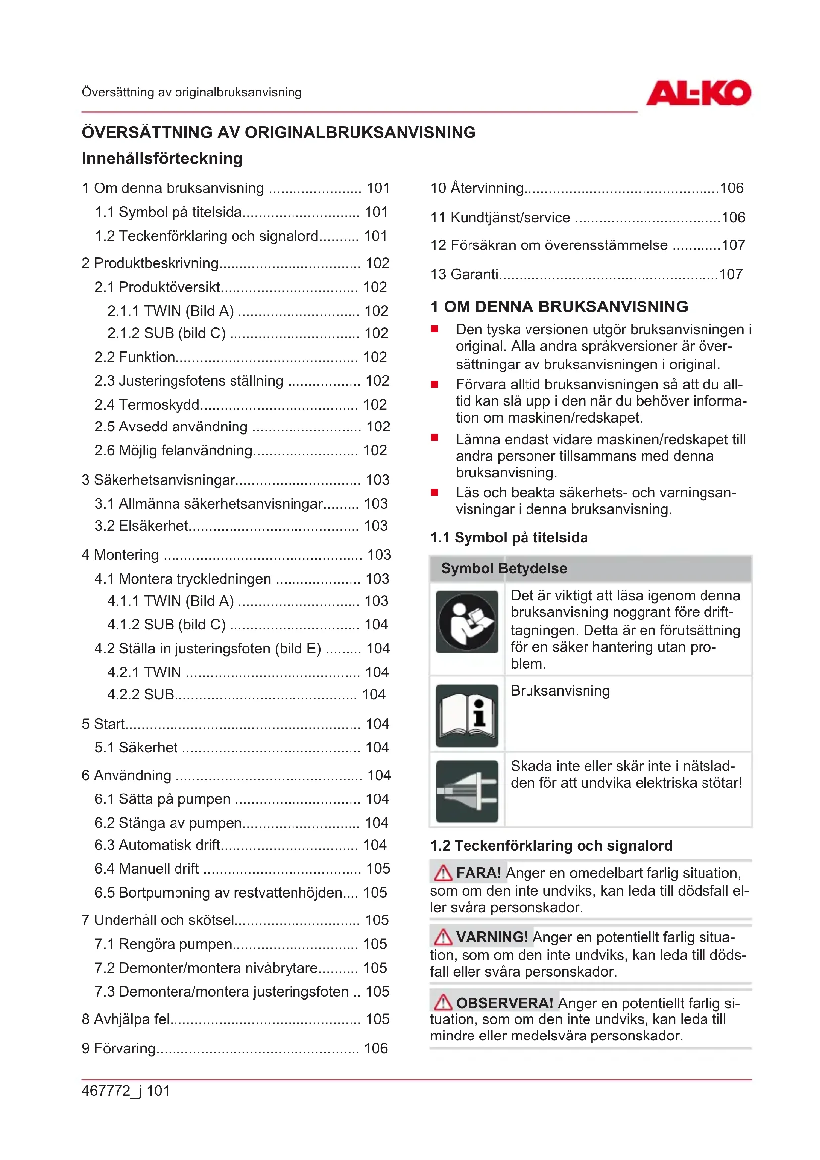 Förvaring Störning Möjlig orsak Avhjälpning Motorn går inte. Löphjulet är blockerat. Ta bort smuts i insugningsområdet. Rengör genom en öppning bak på motorhöljet med ett lämpligt verktyg. Termobrytaren har stängts av. Vänta tills pumpen termobrytare sätts på igen. Var uppmärksam på matningsmediets maximala tempe- ratur. Låt kontrollera pumpen. Det föreligger ingen nätspän- ning. Kontrollera säkringarna och låt en elektriker kontrollera strömförsörj- ningen. Flottörbrytaren kopplar inte när vattennivån höjs. Skicka pumpen till ett av AL-KO:s serviceställen. Pumpen arbetar, men matar inget. Det finns luft i pumphuset. Torrgång, automatisk avstäng- ning efter 90 sekunder. Lufta ur pumpen genom att luta den. Ställ in justeringsfoten. Blockering på sugsidan. Ta bort smuts i insugningsområdet. Tryckledningen är stängd. Öppna tryckledningen. Tryckslangen är böjd. Sträck ut tryckslangen. För liten pumpningsmängd Slangens diameter är för liten. Använd en större tryckslang. Blockering på sugsidan. Ta bort smuts i insugningsområdet. Matningshöjden är för stor. Beakta den maximala matningshöj- den, se den tekniska informationen! Endast pumpar med nivåbrytare Pumpen arbetar alltid. Flottören är blockerad. Brytaren är fel inställd. Rengör flottören. Ställ in brytaren korrekt. Pumpen är alltid avstängd. Flottören är blockerad. Vattennivån är för låg. Rengör flottören. 9 FÖRVARING ANMÄRKNING Vid fara för frost måste pumpen tömmas helt och förvaras på frostskyd- dad plats. 10 ÅTERVINNING Elektrisk och elektronisk utrustning ska inte läggas i soporna utan hanteras med sär- skild återvinning! Förpackning, enhet och tillbehör är tillverkade av återvinningsbara material och ska avfallshanteras på motsvarande sätt.
