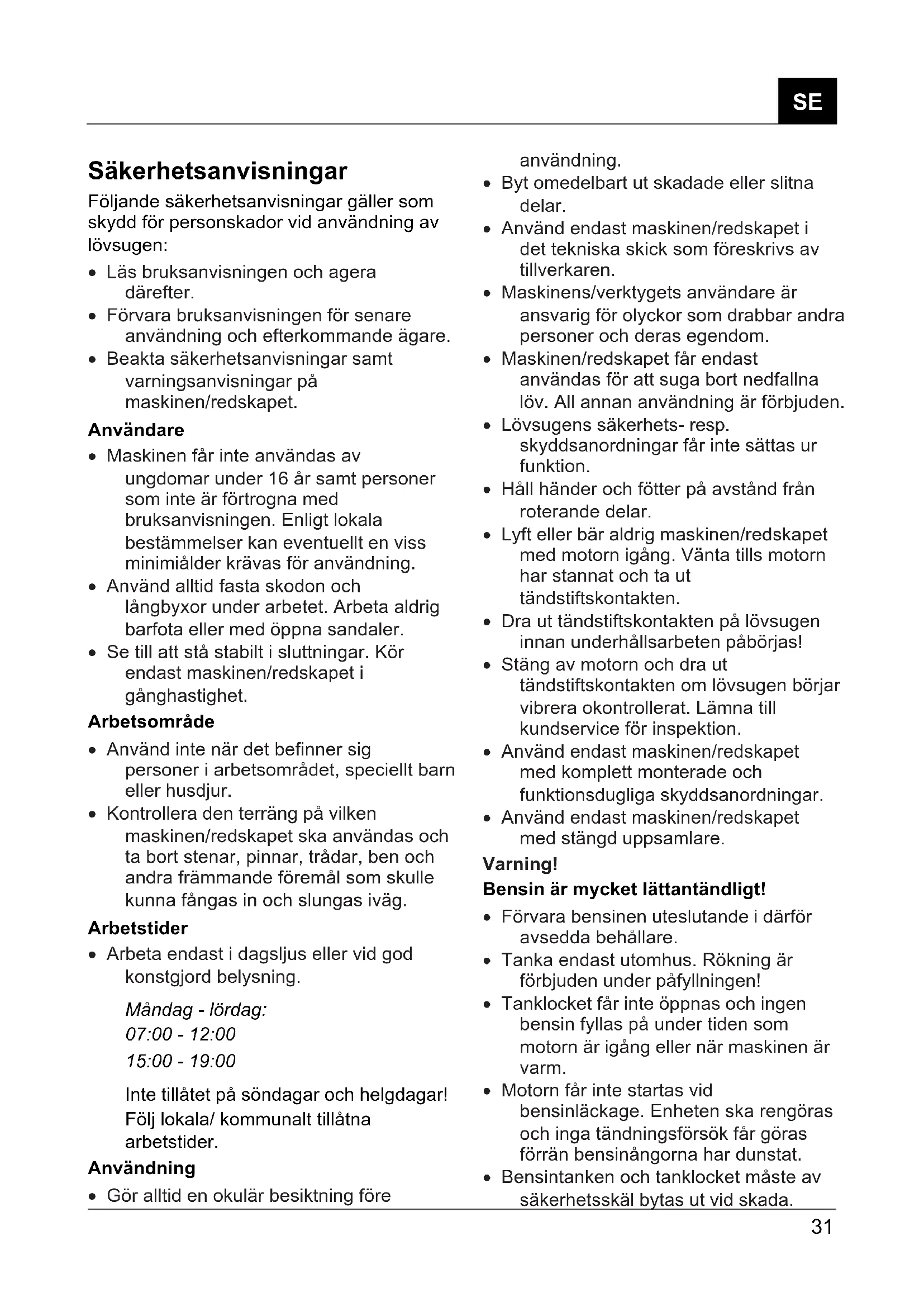 - Tanklocket får inte öppnas och ingen bensin fyllas på under tiden som motorn är igång eller när maskinen är varm.