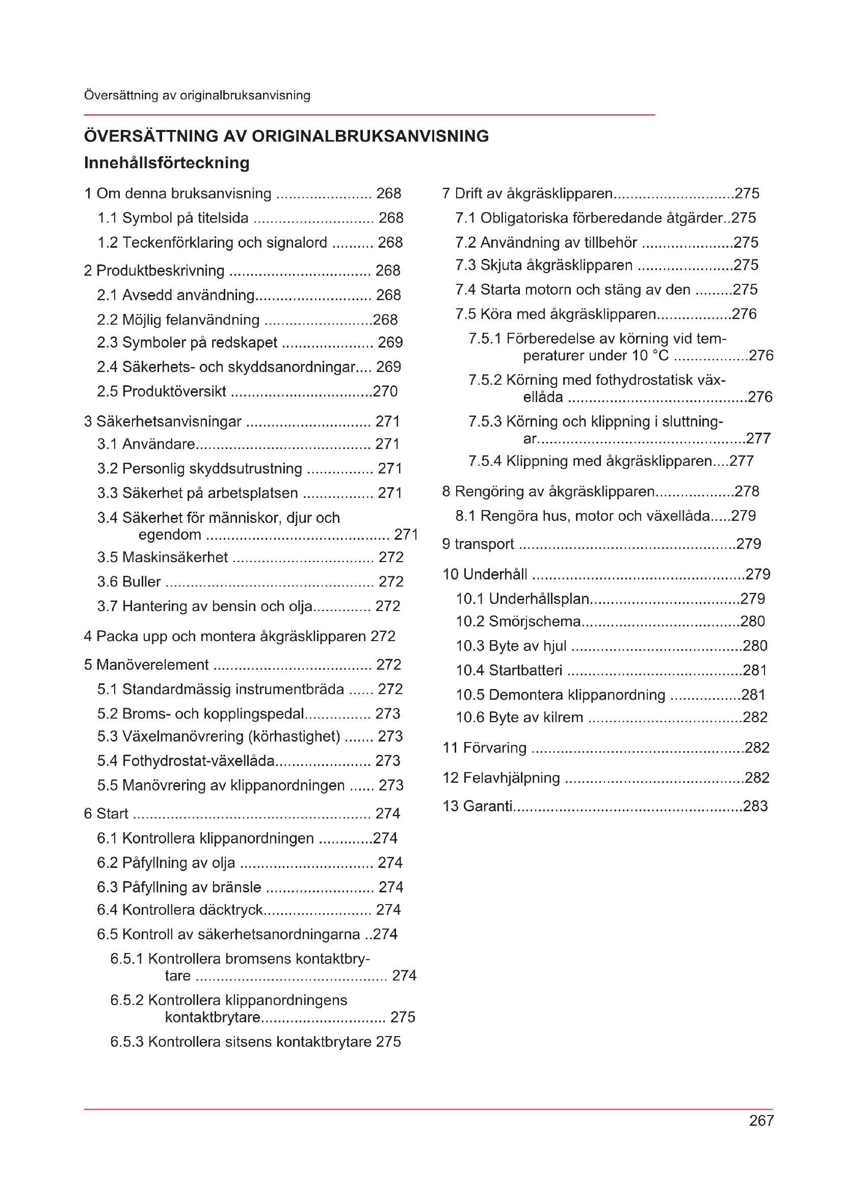 4 Packa upp och montera åkgräsklipparen 272 5 Manöverelement ...................................... 272
