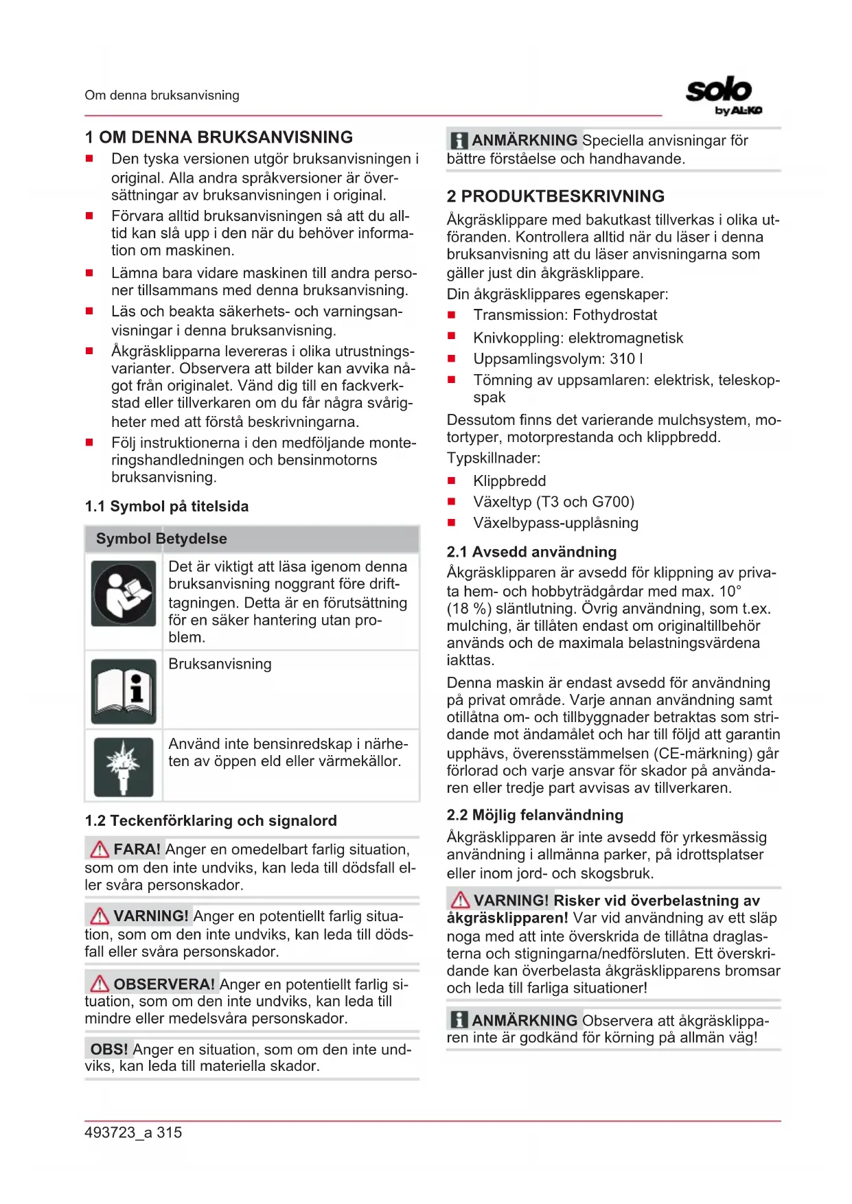 FARA! Anger en omedelbart farlig situation, som om den inte undviks, kan leda till dödsfall el- ler svåra personskador. VARNING! Anger en potentiellt farlig situa- tion, som om den inte undviks, kan leda till döds- fall eller svåra personskador. OBSERVERA! Anger en potentiellt farlig si- tuation, som om den inte undviks, kan leda till mindre eller medelsvåra personskador. OBS! Anger en situation, som om den inte und- viks, kan leda till materiella skador. ANMÄRKNING Speciella anvisningar för bättre förståelse och handhavande. 2 PRODUKTBESKRIVNING Åkgräsklippare med bakutkast tillverkas i olika ut- föranden. Kontrollera alltid när du läser i denna bruksanvisning att du läser anvisningarna som gäller just din åkgräsklippare. Din åkgräsklippares egenskaper: