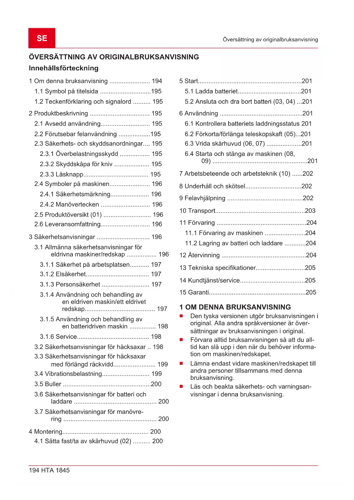 siktligt start: se Kapitel 5.2 "Ansluta och dra bort batteri (03, 04)", sida201.SE 202 HTA 1845 Arbetsbeteende och arbetsteknik (10) 7 ARBETSBETEENDE OCH ARBETSTEKNIK (10) VARNING! Fara för nedstörtning. Det fö- religger alltid en fara för nedstörtning om man ar- betar från en position ovan mark som t.ex. på en stege.