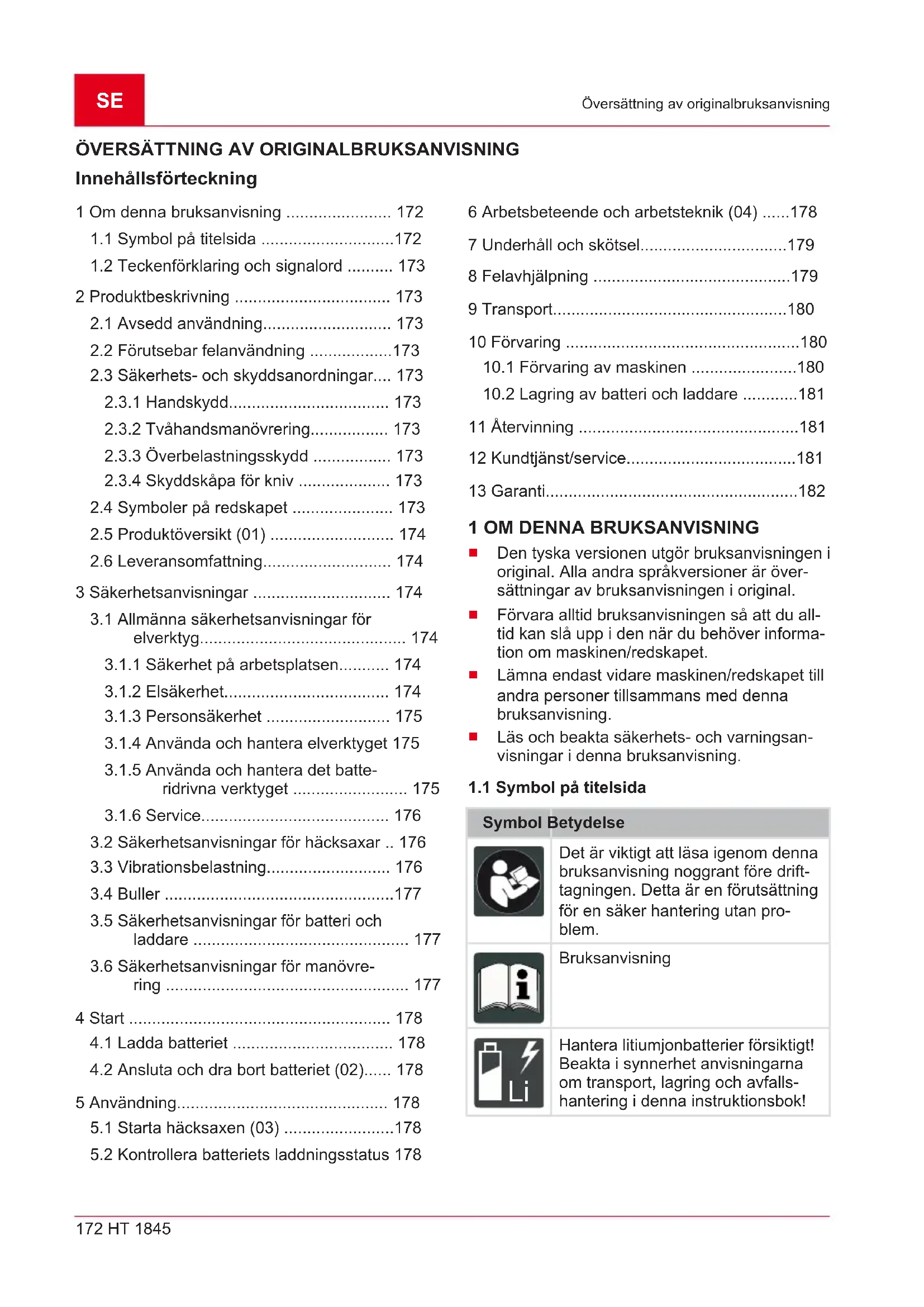 Ladda enbart batterierna i laddare som re- kommenderas av tillverkaren. Det finns riskSE 176 HT 1845 Säkerhetsanvisningar för brand om ett batteri laddas i en laddare som inte är avsedd för denna typ av batterier.