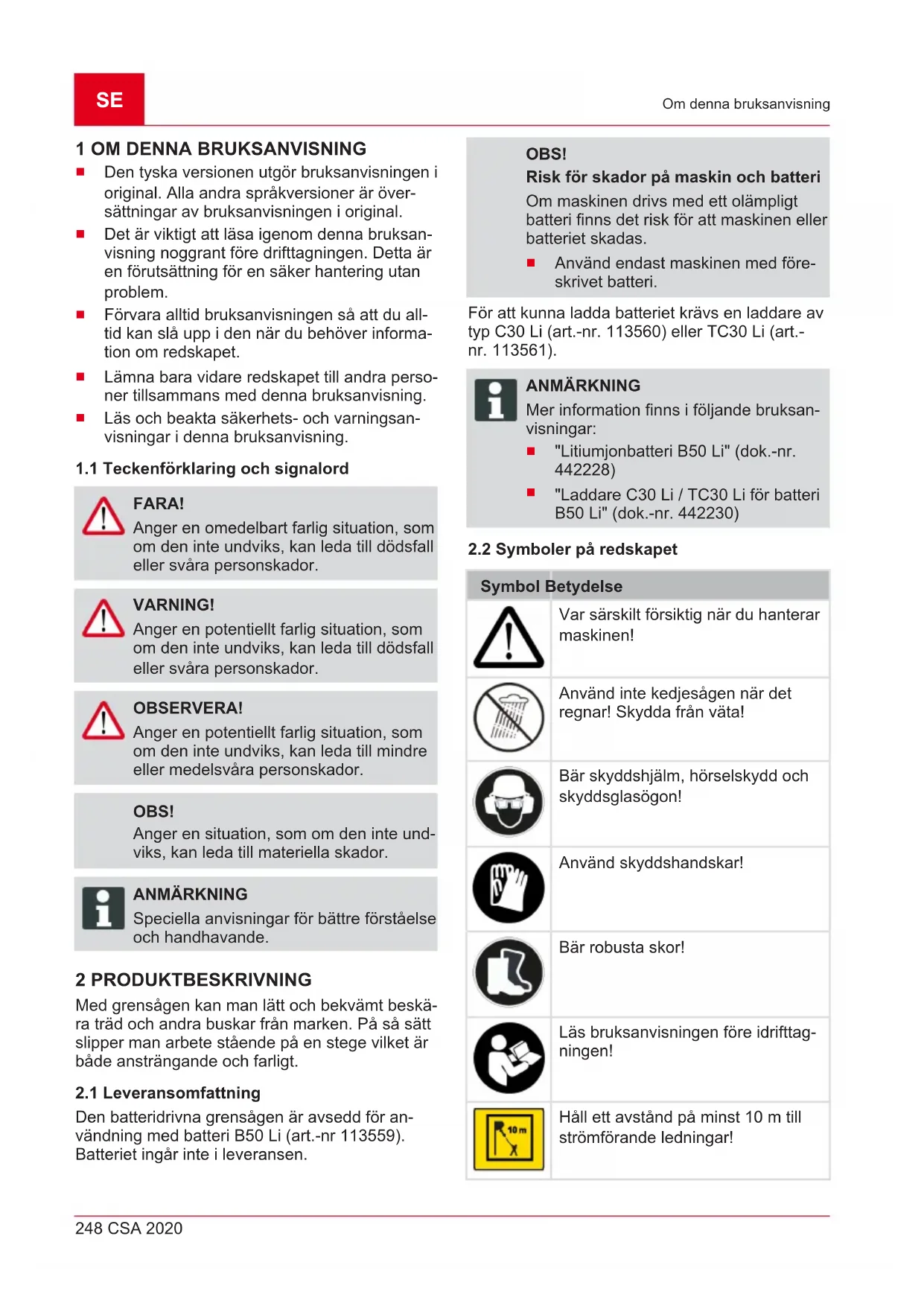 Nr. Komponent 1 Skyddskåpa för styrskena 2 Teleskopstång 3 Påfyllningsöppning till oljetank 4 Sågkedja 5 Styrskena 6 Fästskruv 7 Kedjehjulsskydd 8 Tretaggad klo 9 Siktglas till oljetank 10 Klämskruv 11 Kedjespännarskruv 12 Batteri 13 På/av-brytare 14 Upplåsningsknapp 15 Handtag 16 Ögla för axelrem 17 BärremSE 250 CSA 2020 Säkerhet 3 SÄKERHET