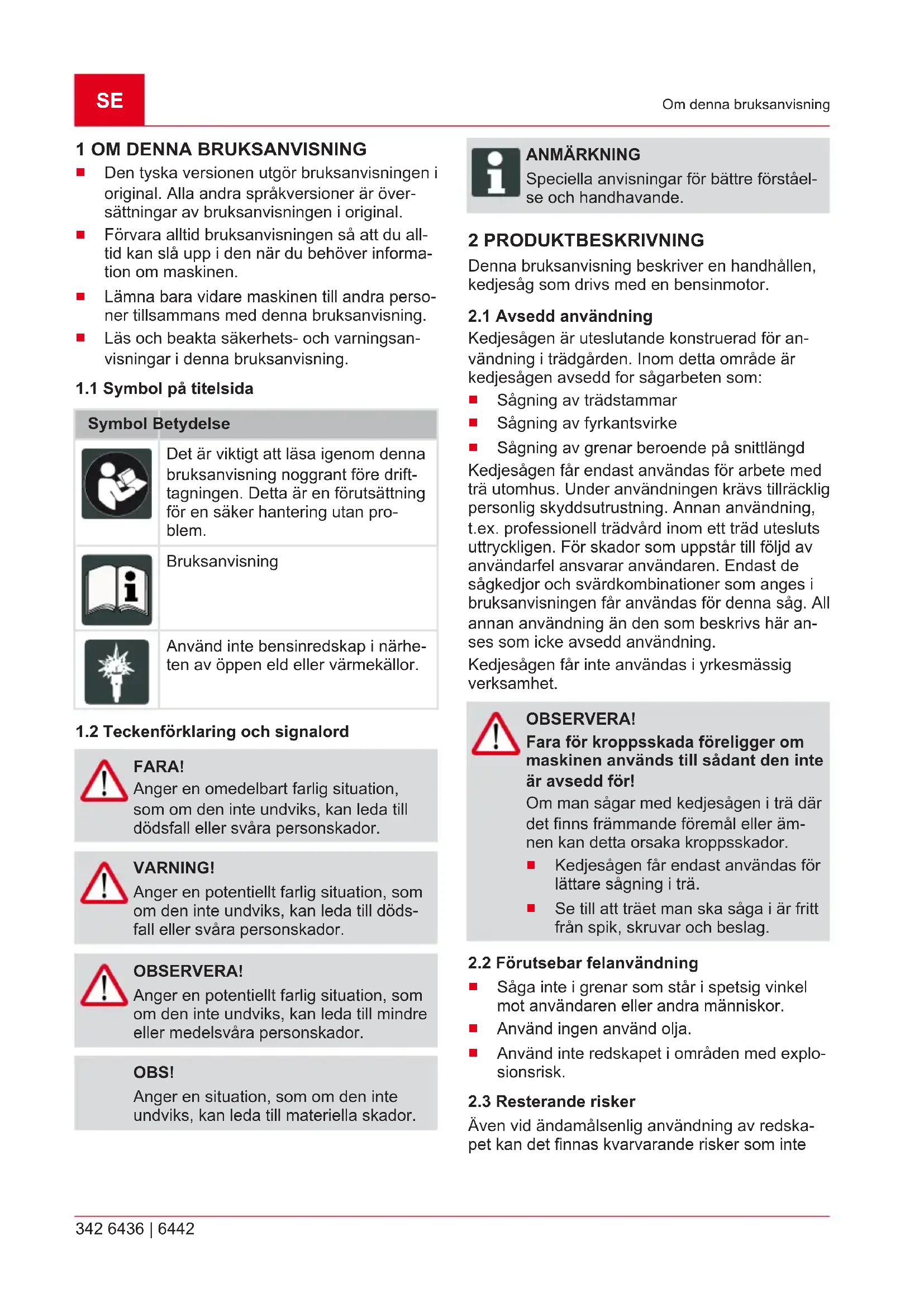 FARA! Anger en omedelbart farlig situation, som om den inte undviks, kan leda till dödsfall eller svåra personskador. VARNING! Anger en potentiellt farlig situation, som om den inte undviks, kan leda till döds- fall eller svåra personskador. OBSERVERA! Anger en potentiellt farlig situation, som om den inte undviks, kan leda till mindre eller medelsvåra personskador. OBS! Anger en situation, som om den inte undviks, kan leda till materiella skador. ANMÄRKNING Speciella anvisningar för bättre förståel- se och handhavande. 2 PRODUKTBESKRIVNING Denna bruksanvisning beskriver en handhållen, kedjesåg som drivs med en bensinmotor.