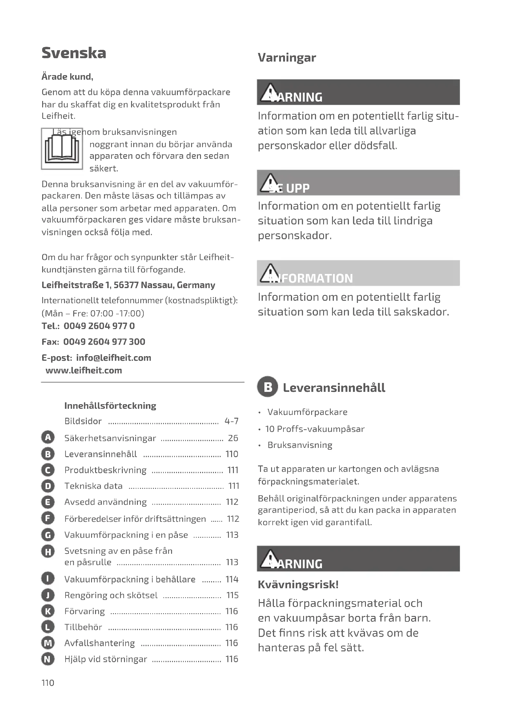 - Sørg for, at kanten på beholderen er tilstræk- kelig ren. Hvis du kan udelukke alle ovennæv- nte situationer, bedes du venligst henvende dig det oplyste serviceværksted. DK110 Innehållsförteckning Bildsidor ................................................... 4-7 Säkerhetsanvisningar ............................. 26 Leveransinnehåll .................................... 110 Produktbeskrivning ................................. 111 Tekniska data ............................................ 111 Avsedd användning ................................ 112 Förberedelser inför driftsättningen ...... 112 Vakuumförpackning i en påse ............. 113 Svetsning av en påse från en påsrulle ................................................ 113 Vakuumförpackning i behållare ......... 114 Rengöring och skötsel ........................... 115 Förvaring ................................................... 116 Tillbehör .................................................... 116 Avfallshantering ..................................... 116 Hjälp vid störningar ................................ 116 Svenska Ärade kund, Genom att du köpa denna vakuumförpackare har du skaffat dig en kvalitetsprodukt från Leifheit. Läs igenom bruksanvisningen noggrant innan du börjar använda apparaten och förvara den sedan säkert. Denna bruksanvisning är en del av vakuumför- packaren. Den måste läsas och tillämpas av alla personer som arbetar med apparaten. Om vakuumförpackaren ges vidare måste bruksan- visningen också följa med. VARNING VARNING Varningar Information om en potentiellt farlig situ- ation som kan leda till allvarliga personskador eller dödsfall. Kvävningsrisk! Hålla förpackningsmaterial och en vakuumpåsar borta från barn. Det nns risk att kvävas om de hanteras på fel sätt.
