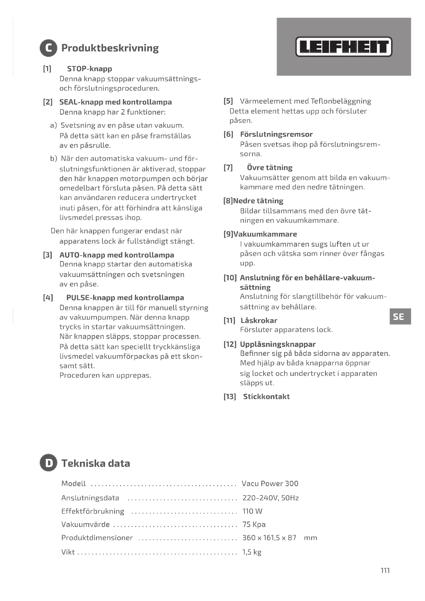 Leveransinnehåll SE UPP Informationomenpotentielltfarlig situationsomkanledatilllindriga personskador. INFORMATION Informationomenpotentielltfarlig situationsomkanledatillsakskador. OmduharfrågorochsynpunkterstårLeifheit- kundtjänstengärnatillförfogande. Leifheitstraße1,56377Nassau,Germany Internationellttelefonnummer(kostnadspliktigt): (Mån–Fre:07:00-17:00) Tel.: 004926049770 Fax: 00492604977300 E-post: info@leifheit.com www.leifheit.com111 Modell.........................................VacuPower300 Anslutningsdata ...............................220-240V,50Hz Effektförbrukning ..............................110W Vakuumvärde...................................75Kpa Produktdimensioner............................360x161,5x87 mm Vikt .............................................1,5kg [1] STOP-knapp Dennaknappstopparvakuumsättnings- ochförslutningsproceduren. [2] SEAL-knappmedkontrollampa Dennaknapphar2funktioner: a)Svetsningavenpåseutanvakuum. Pådettasättkanenpåseframställas avenpåsrulle. b)Närdenautomatiskavakuum-undför- slutningsfunktionenäraktiverad,stoppar denhärknappenmotorpumpenochbörjar omedelbartförslutapåsen.Pådettasätt kananvändarenreduceraundertrycket inutipåsen,förattförhindraattkänsliga livsmedelpressasihop. Denhärknappenfungerarendastnär apparatenslockärfullständigtstängt. [3] AUTO-knappmedkontrollampa Dennaknappstartardenautomatiska vakuumsättningenochsvetsningen avenpåse. [4] PULSE-knappmedkontrollampa Dennaknappenärtillförmanuellstyrning avvakuumpumpen.Närdennaknapp trycksinstartarvakuumsättningen. Närknappensläpps,stopparprocessen. Pådettasättkanspeciellttryckkänsliga livsmedelvakuumförpackaspåettskon- samtsätt. Procedurenkanupprepas. [5] VärmeelementmedTeonbeläggning Dettaelementhettasuppochförsluter påsen. [6] Förslutningsremsor Påsensvetsasihoppåförslutningsrem- sorna. [7] Övre tätning Vakuumsättergenomattbildaenvakuum- kammaremeddennedretätningen. [8] Nedre tätning Bildartillsammansmeddenövretät- ningenenvakuumkammare. [9] Vakuumkammare Ivakuumkammarensugsluftenutur påsenochvätskasomrinneröverfångas upp. [10] Anslutningförenbehållare-vakuum- sättning Anslutningförslangtillbehörförvakuum- sättningavbehållare. [11] Låskrokar Försluterapparatenslock. [12] Upplåsningsknappar Bennersigpåbådasidornaavapparaten. Medhjälpavbådaknapparnaöppnar siglocketochundertrycketiapparaten släppsut. [13] Stickkontakt