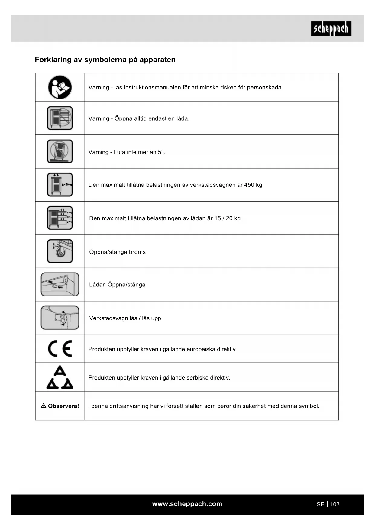Förklaring av symbolerna på apparaten Varning - läs instruktionsmanualen för att minska risken för personskada. Varning - Öppna alltid endast en låda. Varning - Luta inte mer än 5°. 450kg Den maximalt tillåtna belastningen av verkstadsvagnen är 450 kg. 15kg 20kg 20kg Den maximalt tillåtna belastningen av lådan är 15 / 20 kg. Öppna/stänga broms Lådan Öppna/stänga Verkstadsvagn lås / lås upp Produkten uppfyller kraven i gällande europeiska direktiv. Produkten uppfyller kraven i gällande serbiska direktiv. m Observera! I denna driftsanvisning har vi försett ställen som berör din säkerhet med denna symbol.www.scheppach.com