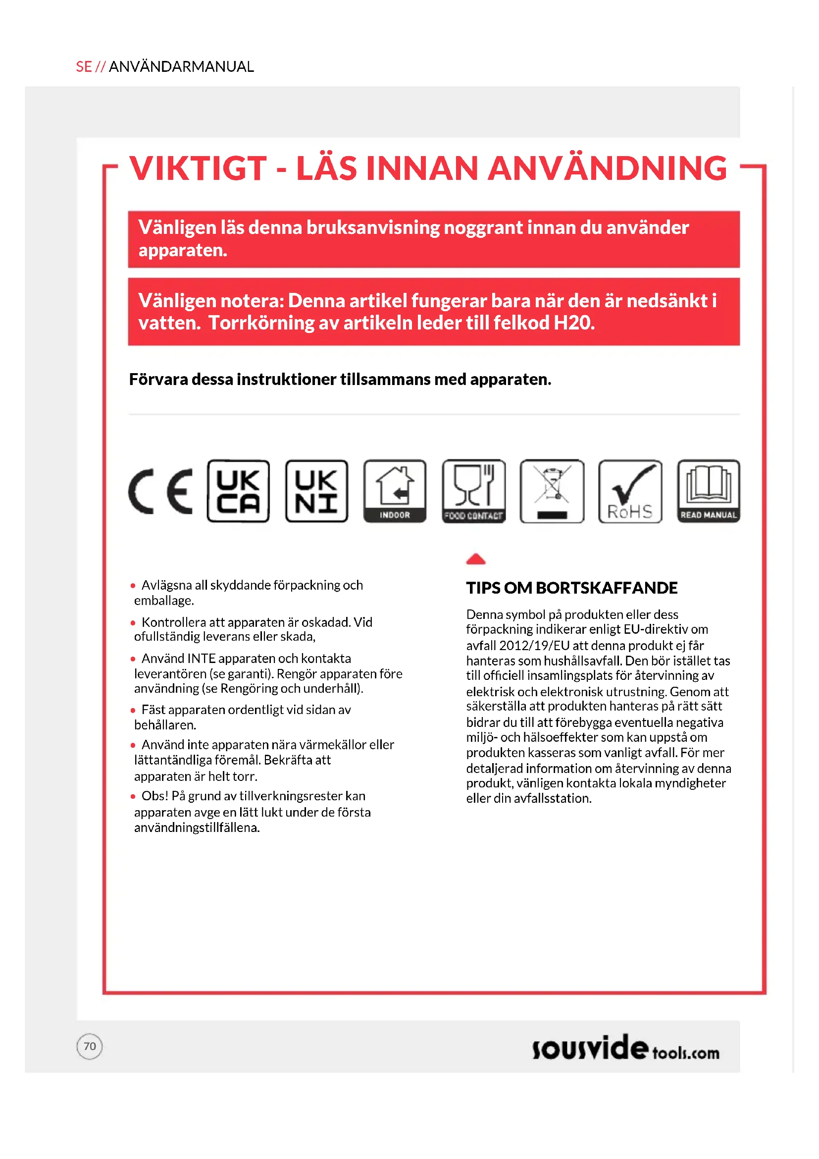 VIKTIGT - LÄS INNAN ANVÄNDNING Vänligen läs denna bruksanvisning noggrant innan du använder apparaten. Vänligen notera: Denna artikel fungerar bara när den är nedsänkt i vatten. Torrkörning av artikeln leder till felkod H20. Förvara dessa instruktioner tillsammans med apparaten.