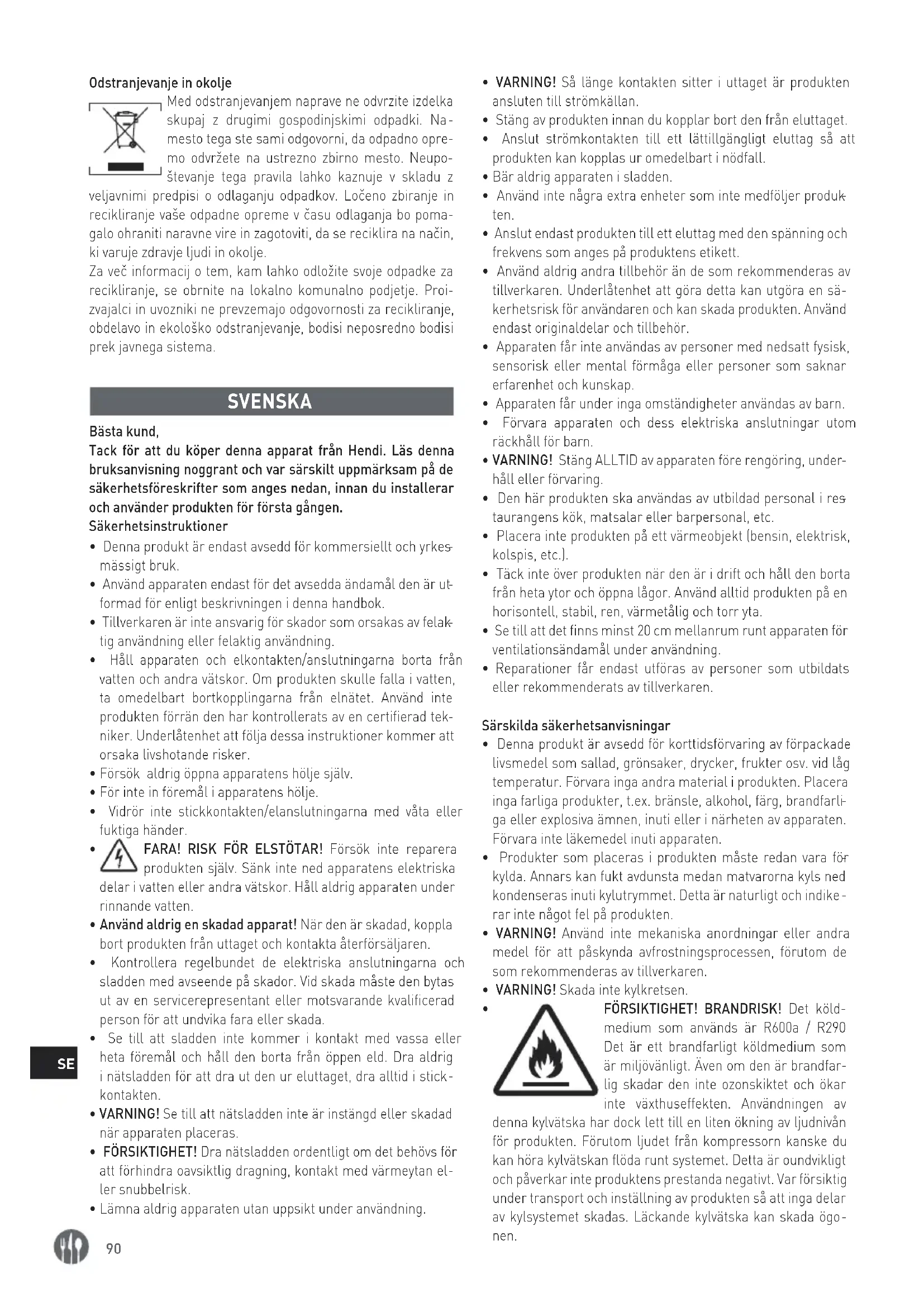 zvajalci in uvozniki ne prevzemajo odgovornosti za recikliranje, obdelavo in ekološko odstranjevanje, bodisi neposredno bodisi prek javnega sistema. SVENSKA Bästa kund, Tack för att du köper denna apparat från Hendi. Läs denna bruksanvisning noggrant och var särskilt uppmärksam på de säkerhetsföreskrifter som anges nedan, innan du installerar och använder produkten för första gången. Säkerhetsinstruktioner