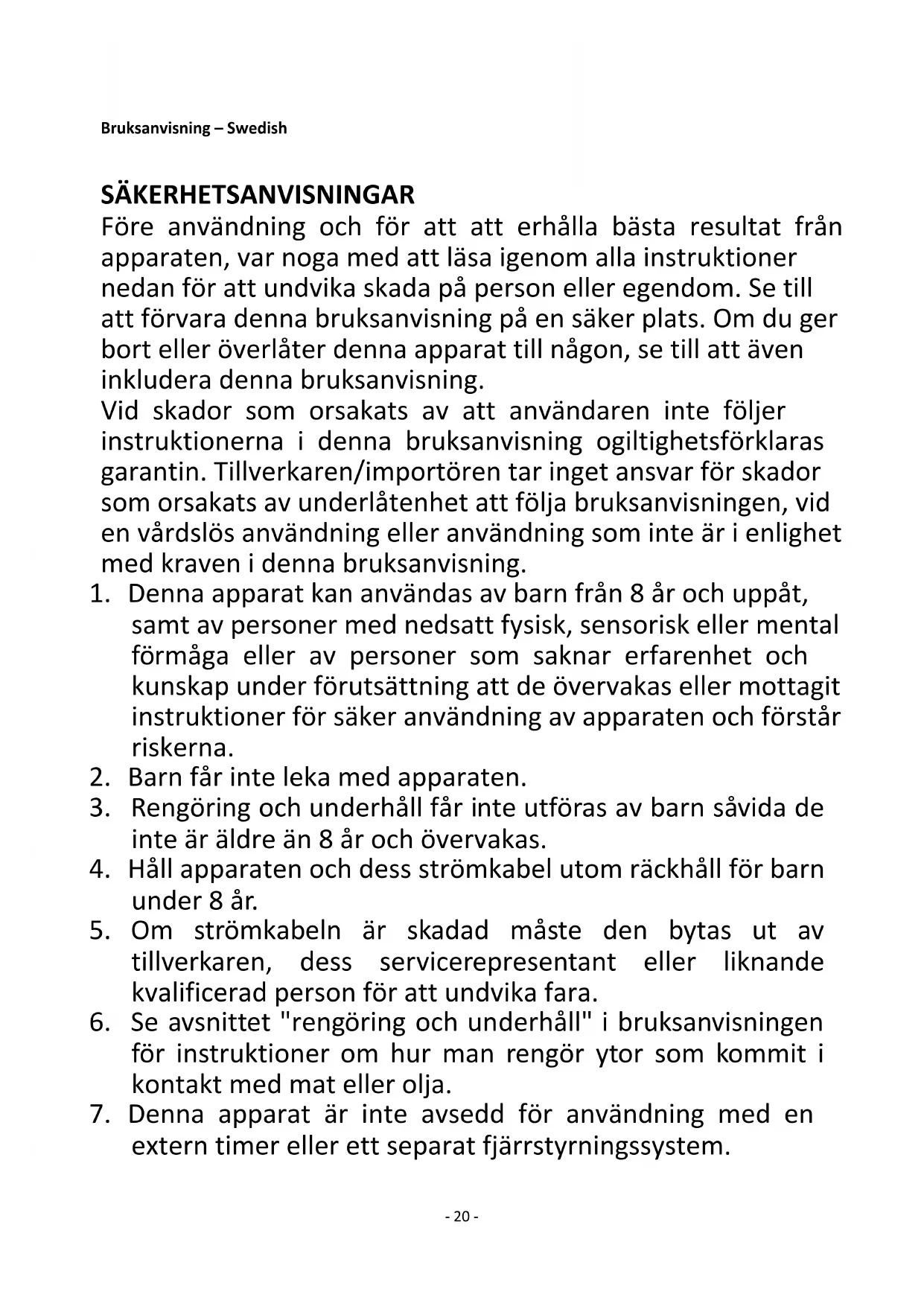 Recyclage – Directive européenne 2012/19/EU Ce symbole indique que le produit ne doit pas être jeté avec les ordures ménagères. Pour limiter les risques pour l’environnement et la santé entraînés par le rejet non contrôlé des déchets, recyclez ce dernier pour promouvoir une réutilisation responsable de ses matériaux. Pour recycler votre produit, utilisez les réseaux de collecte de votre région ou prenez contact avec le revendeur du produit. Ce dernier pourra vous aider à le recycler. Emerio B.V. Customer service: Kundeninformation: Klantenservice: Oudeweg 115 T: +31 (0) 23 3034369 T: +49 (0) 3222 1097 600 T: +31 (0) 23 3034369 2031 CC Haarlem E: info@emerio.eu E: info.de@emerio.eu E: info.nl@emerio.eu The Netherlands- 20 - Bruksanvisning – Swedish SÄKERHETSANVISNINGAR Före användning och för att att erhålla bästa resultat från apparaten, var noga med att läsa igenom alla instruktioner nedan för att undvika skada på person eller egendom. Se till att förvara denna bruksanvisning på en säker plats. Om du ger bort eller överlåter denna apparat till någon, se till att även inkludera denna bruksanvisning. Vid skador som orsakats av att användaren inte följer instruktionerna i denna bruksanvisning ogiltighetsförklaras garantin. Tillverkaren/importören tar inget ansvar för skador som orsakats av underlåtenhet att följa bruksanvisningen, vid en vårdslös användning eller användning som inte är i enlighet med kraven i denna bruksanvisning.