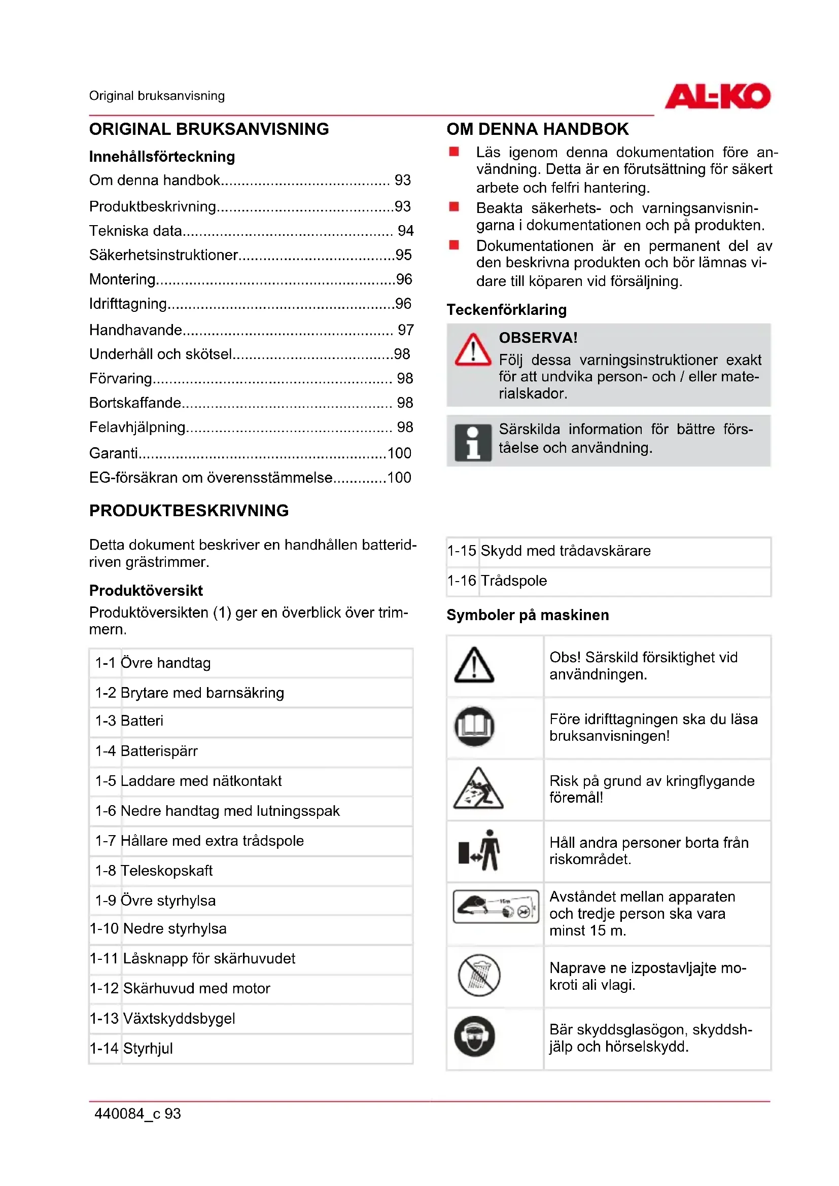 Läs igenom denna dokumentation före an- vändning. Detta är en förutsättning för säkert arbete och felfri hantering. Beakta säkerhets- och varningsanvisnin- garna i dokumentationen och på produkten. Dokumentationen är en permanent del av den beskrivna produkten och bör lämnas vi- dare till köparen vid försäljning. Teckenförklaring OBSERVA! Följ dessa varningsinstruktioner exakt för att undvika person- och / eller mate- rialskador. ADVICE Särskilda information för bättre förs- tåelse och användning. PRODUKTBESKRIVNING Detta dokument beskriver en handhållen batterid- riven grästrimmer. Produktöversikt Produktöversikten (1) ger en överblick över trim- mern. 1-1 Övre handtag 1-2 Brytare med barnsäkring 1-3 Batteri 1-4 Batterispärr 1-5 Laddare med nätkontakt 1-6 Nedre handtag med lutningsspak 1-7 Hållare med extra trådspole 1-8 Teleskopskaft 1-9 Övre styrhylsa 1-10 Nedre styrhylsa 1-11 Låsknapp för skärhuvudet 1-12 Skärhuvud med motor 1-13 Växtskyddsbygel 1-14 Styrhjul 1-15 Skydd med trådavskärare 1-16 Trådspole Symboler på maskinen Obs! Särskild försiktighet vid användningen. Före idrifttagningen ska du läsa bruksanvisningen! Risk på grund av kringflygande föremål! Håll andra personer borta från riskområdet. Avståndet mellan apparaten och tredje person ska vara minst 15 m. Naprave ne izpostavljajte mo- kroti ali vlagi. Bär skyddsglasögon, skyddsh- jälp och hörselskydd.sv Produktbeskrivning 94 GTLi 18V Ta bort batteriet innan justering eller rengöring av utrustningen görs eller när enheten lämnas obevakad för en stund. Reglerbart teleskopskaft. Grästrimmern är utrustad med ett reglerbart tele- skopskaft. Detta innebär att verktyget kan ställas in efter individuell kroppslängd och att motorhuvu- det kan vridas. Vridbart och reglerbart skärhuvud GT Li18V är utrustad med ett vridbart och lut- ningsbart skärhuvud. Tippautomatik I trådhuvudet sitter en tippautomatik (8-4) som gör att tråden kan förlängas vid påslagen motor. Säkerhets- och skyddsanordningar Barnsäkring Hålet (5 mm) på motorskyddsbrytaren är avsett för ett hänglås*. Hänglåset förhindrar otillåten an- vändning av trimmern.