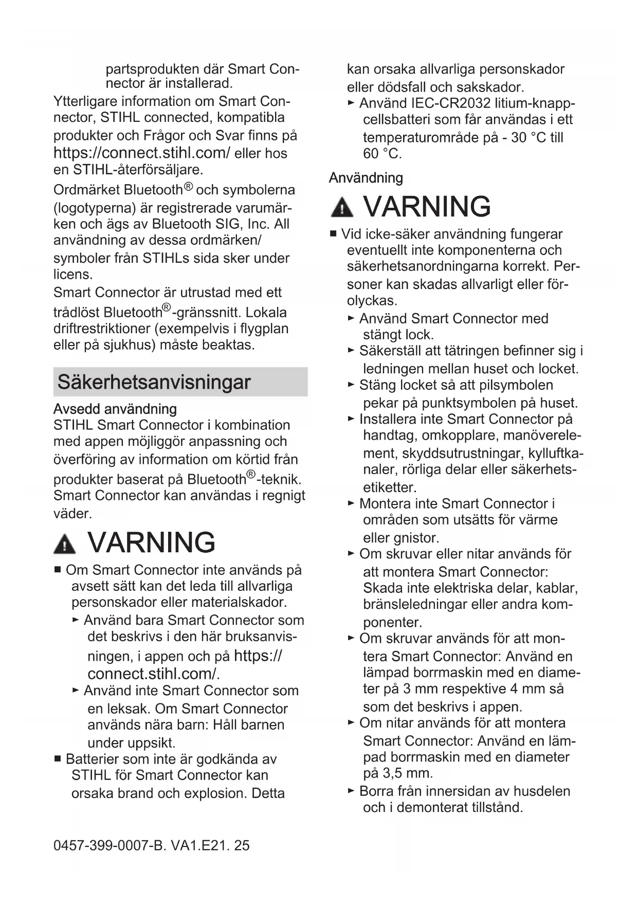 OCH SPARA DEN. Läs och observera följande information och säkerhetsanvis‐ ningar. Felaktig användning kan leda till allvarliga personskador. Läs och följ alla säkerhetsanvis‐ ningar i bruksanvisningen för STIHL-produkten eller tredje‐ 24 0457-399-0007-B. VA1.E21.partsprodukten där Smart Con‐ nector är installerad. Ytterligare information om Smart Con‐ nector, STIHL connected, kompatibla produkter och Frågor och Svar finns på https://connect.stihl.com/ eller hos en STIHL-återförsäljare. Ordmärket Bluetooth