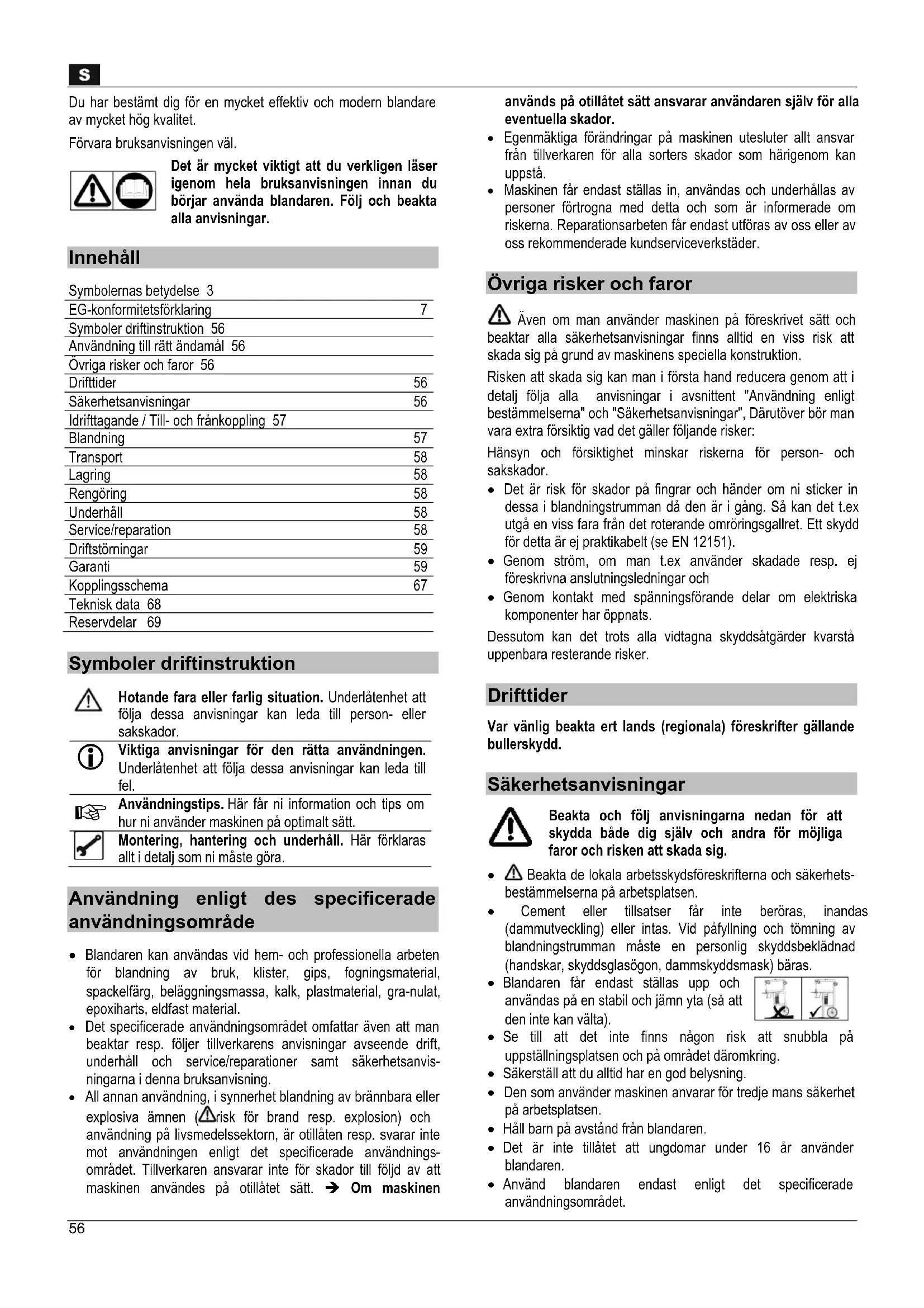 Användningstips. Här får ni information och tips om hur ni använder maskinen på optimalt sätt. Montering, hantering och underhåll. Här förklaras allt i detalj som ni måste göra. Användning enligt des specificerade användningsområde Blandaren kan användas vid hem- och professionella arbeten för blandning av bruk, klister, gips, fogningsmaterial, spackelfärg, beläggningsmassa, kalk, plastmaterial, gra-nulat, epoxiharts, eldfast material. Det specificerade användningsområdet omfattar även att man beaktar resp. följer tillverkarens anvisningar avseende drift, underhåll och service/reparationer samt säkerhetsanvis- ningarna i denna bruksanvisning. All annan användning, i synnerhet blandning av brännbara eller explosiva ämnen ( risk för brand resp. explosion) och användning på livsmedelssektorn, är otillåten resp. svarar inte mot användningen enligt det specificerade användnings- området. Tillverkaren ansvarar inte för skador till följd av att maskinen användes på otillåtet sätt. Om maskinen används på otillåtet sätt ansvarar användaren själv för alla eventuella skador. Egenmäktiga förändringar på maskinen utesluter allt ansvar från tillverkaren för alla sorters skador som härigenom kan uppstå. Maskinen får endast ställas in, användas och underhållas av personer förtrogna med detta och som är informerade om riskerna. Reparationsarbeten får endast utföras av oss eller av oss rekommenderade kundserviceverkstäder. Övriga risker och faror Även om man använder maskinen på föreskrivet sätt och beaktar alla säkerhetsanvisningar finns alltid en viss risk att skada sig på grund av maskinens speciella konstruktion. Risken att skada sig kan man i första hand reducera genom att i detalj följa alla anvisningar i avsnittent "Användning enligt bestämmelserna" och "Säkerhetsanvisningar", Därutöver bör man vara extra försiktig vad det gäller följande risker: Hänsyn och försiktighet minskar riskerna för person- och sakskador. Det är risk för skador på fingrar och händer om ni sticker in dessa i blandningstrumman då den är i gång. Så kan det t.ex utgå en viss fara från det roterande omröringsgallret. Ett skydd för detta är ej praktikabelt (se EN 12151). Genom ström, om man t.ex använder skadade resp. ej föreskrivna anslutningsledningar och Genom kontakt med spänningsförande delar om elektriska komponenter har öppnats. Dessutom kan det trots alla vidtagna skyddsåtgärder kvarstå uppenbara resterande risker. Drifttider Var vänlig beakta ert lands (regionala) föreskrifter gällande bullerskydd. Säkerhetsanvisningar