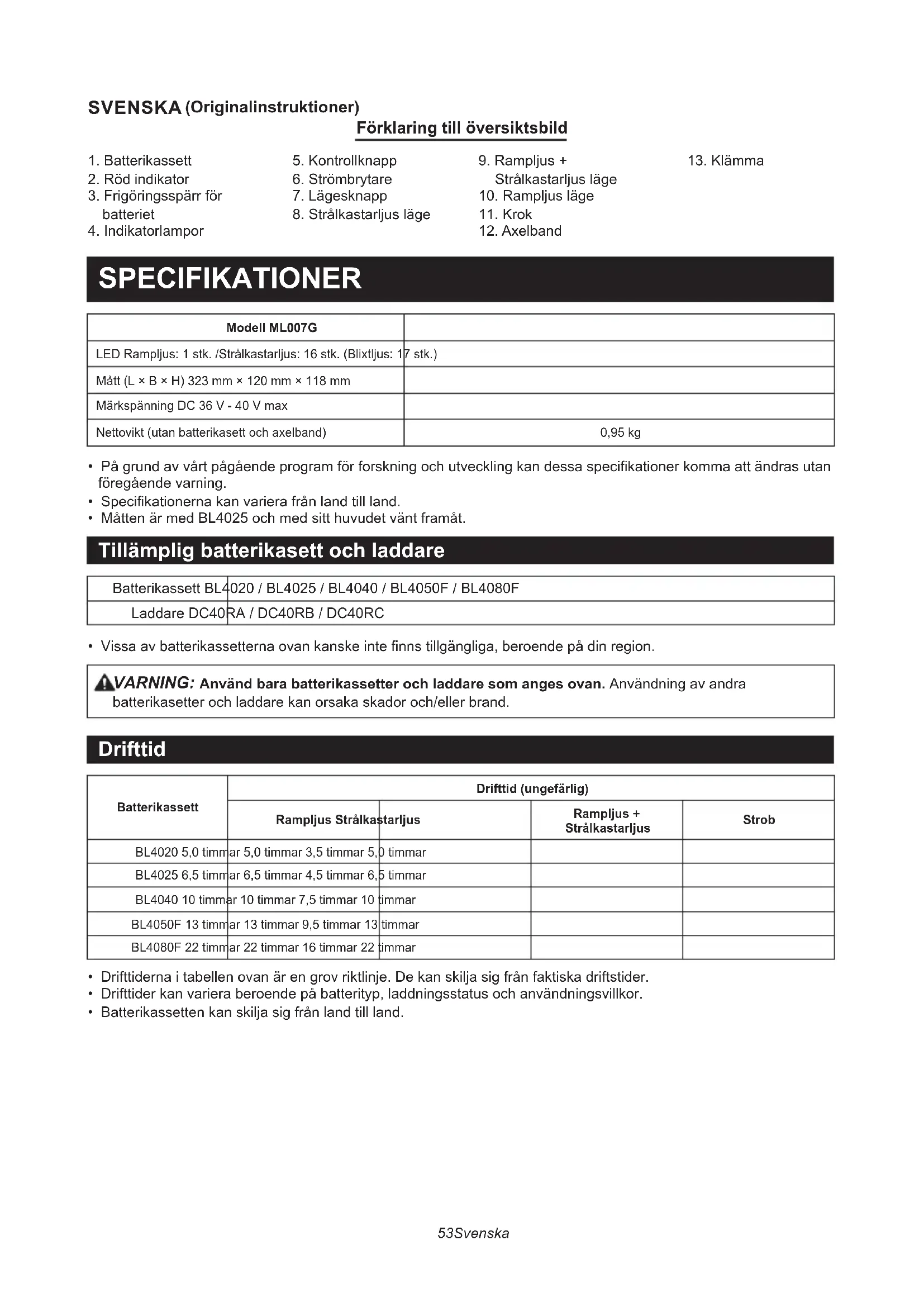 - Vissa av batterikassetterna ovan kanske inte finns tillgängliga, beroende på din region. VARNING: Använd bara batterikassetter och laddare som anges ovan. Användning av andra batterikasetter och laddare kan orsaka skador och/eller brand. Drifttid BatterikassettDrifttid (ungefärlig)Rampljus StrålkastarljusRampljus + StrålkastarljusStrobBL4020 5,0 timmar 5,0 timmar 3,5 timmar 5,0 timmarBL4025 6,5 timmar 6,5 timmar 4,5 timmar 6,5 timmarBL4040 10 timmar 10 timmar 7,5 timmar 10 timmarBL4050F 13 timmar 13 timmar 9,5 timmar 13 timmarBL4080F 22 timmar 22 timmar 16 timmar 22 timmar