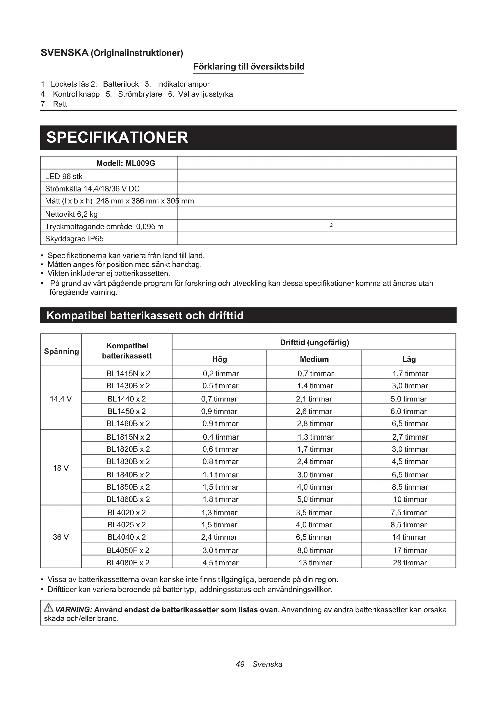 - På grund av vårt pågående program för forskning och utveckling kan dessa specifikationer komma att ändras utan föregående varning. Kompatibel batterikassett och drifttid Spänning Kompatibel batterikassett Drifttid (ungefärlig) Hög Medium Låg 14,4 V BL1415N x 2 0,2 timmar 0,7 timmar 1,7 timmar BL1430B x 2 0,5 timmar 1,4 timmar 3,0 timmar BL1440 x 2 0,7 timmar 2,1 timmar 5,0 timmar BL1450 x 2 0,9 timmar 2,6 timmar 6,0 timmar BL1460B x 2 0,9 timmar 2,8 timmar 6,5 timmar 18 V BL1815N x 2 0,4 timmar 1,3 timmar 2,7 timmar BL1820B x 2 0,6 timmar 1,7 timmar 3,0 timmar BL1830B x 2 0,8 timmar 2,4 timmar 4,5 timmar BL1840B x 2 1,1 timmar 3,0 timmar 6,5 timmar BL1850B x 2 1,5 timmar 4,0 timmar 8,5 timmar BL1860B x 2 1,8 timmar 5,0 timmar 10 timmar 36 V BL4020 x 2 1,3 timmar 3,5 timmar 7,5 timmar BL4025 x 2 1,5 timmar 4,0 timmar 8,5 timmar BL4040 x 2 2,4 timmar 6,5 timmar 14 timmar BL4050F x 2 3,0 timmar 8,0 timmar 17 timmar BL4080F x 2 4,5 timmar 13 timmar 28 timmar