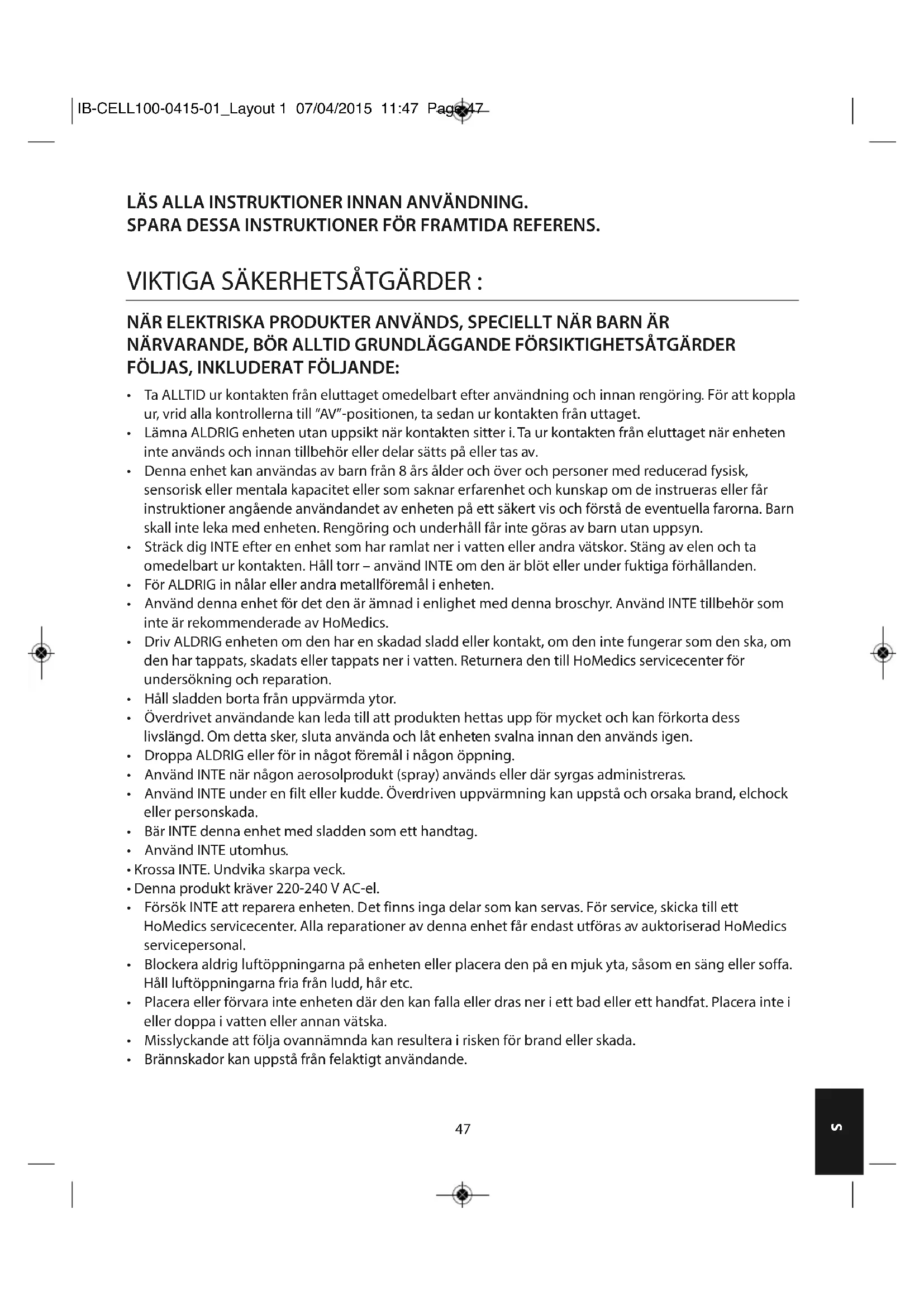 - Brännskador kan uppstå från felaktigt användande. IB-CELL100-0415-01_Layout 1 07/04/2015 11:47 Page 4748