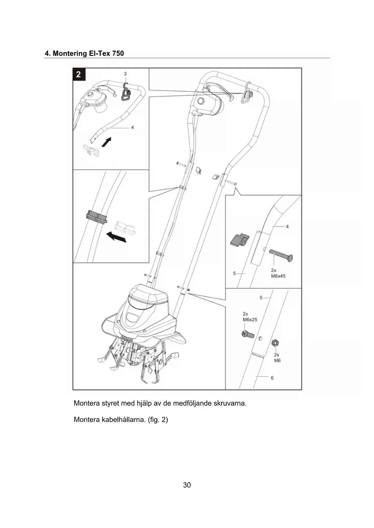 Montera styret med hjälp av de medföljande skruvarna. Montera kabelhållarna. (fig. 2)31