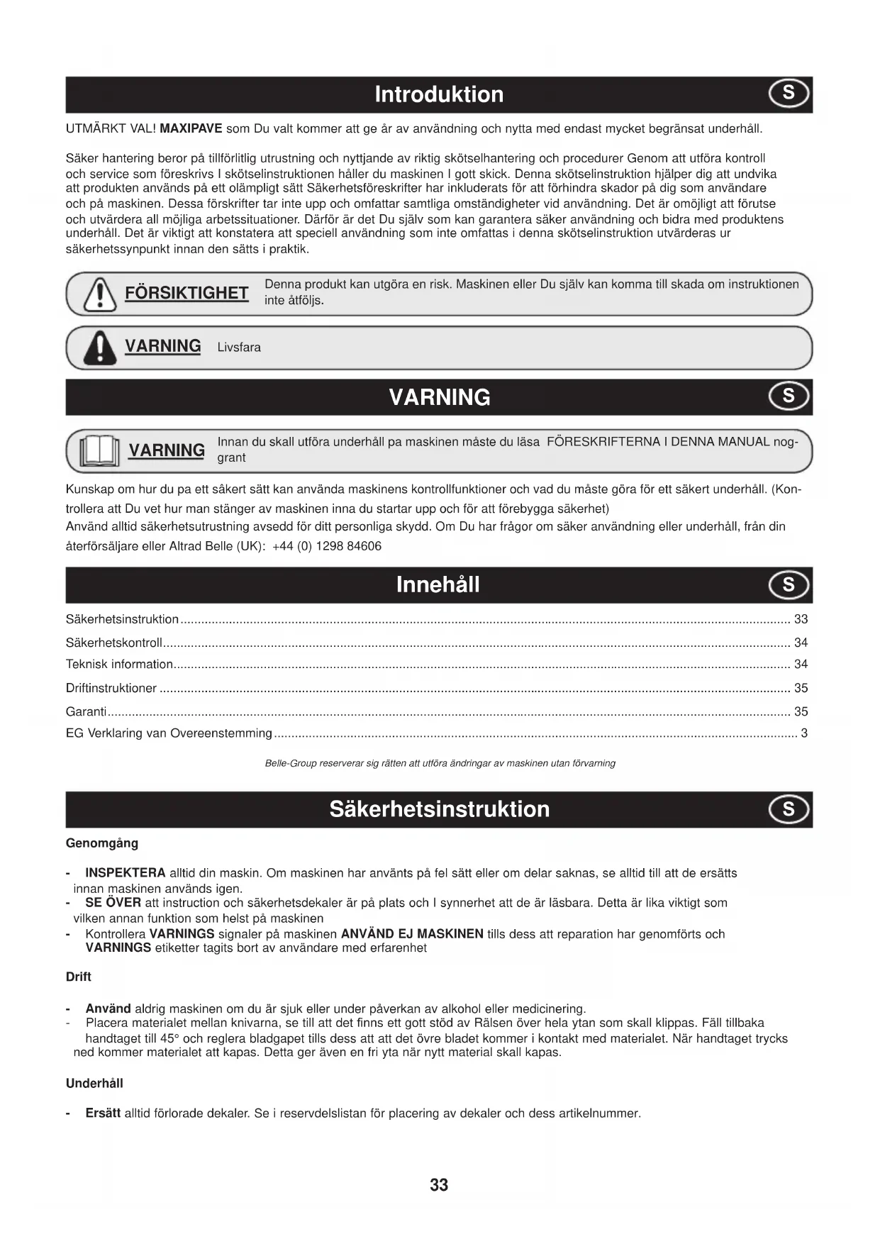 Innan du skall utföra underhåll pa maskinen måste du läsa FÖRESKRIFTERNA I DENNA MANUAL nog- grant VARNING Innehåll Kunskap om hur du pa ett sâkert sätt kan använda maskinens kontrollfunktioner och vad du måste göra för ett säkert underhåll. (Kon- trollera att Du vet hur man stänger av maskinen inna du startar upp och för att förebygga säkerhet) Använd alltid säkerhetsutrustning avsedd för ditt personliga skydd. Om Du har frågor om säker användning eller underhåll, från din återförsäljare eller Altrad Belle (UK): +44 (0) 1298 84606 S34 Säkerhetskontroll