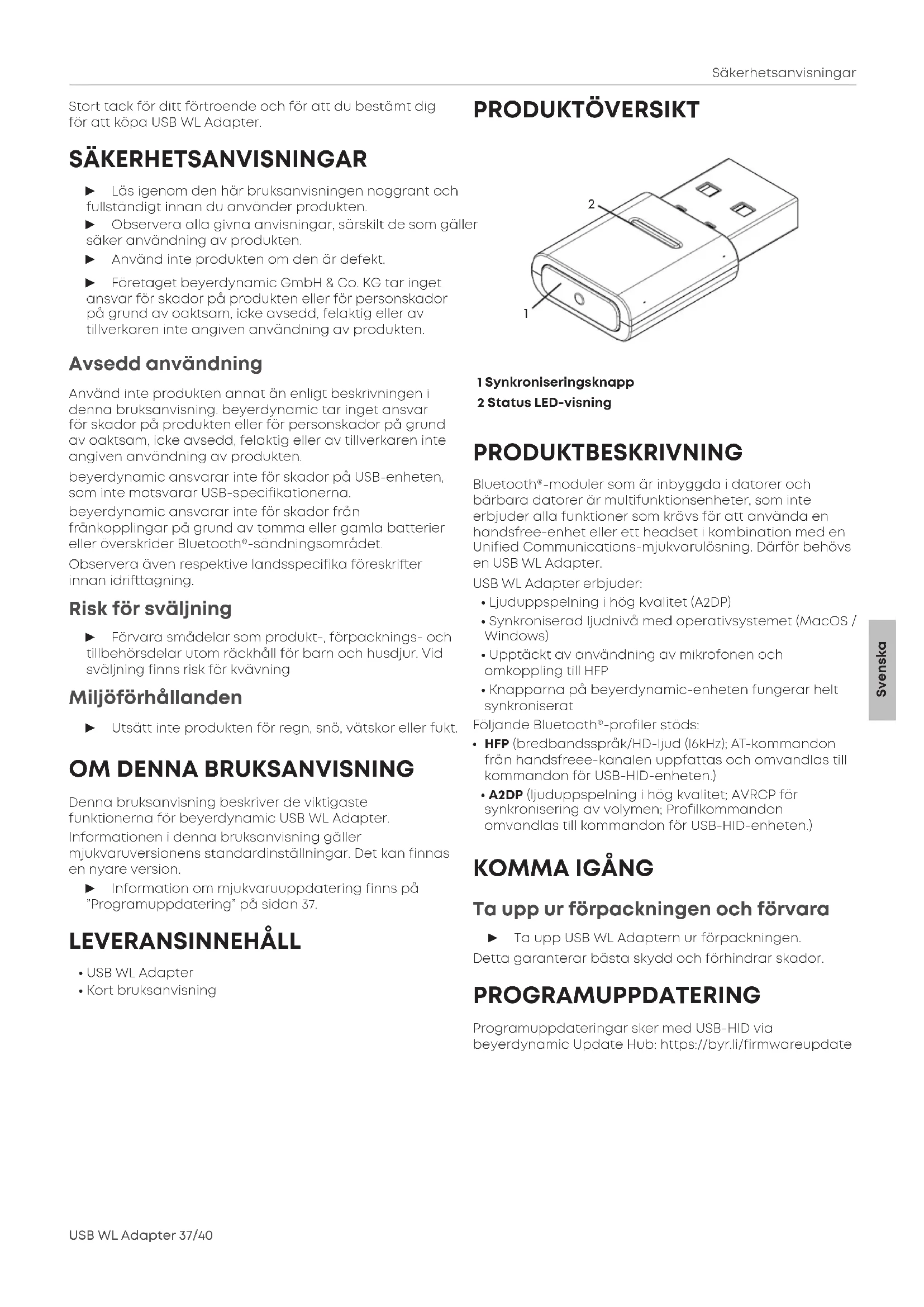 TEKNISKA DATA ....................................... 40 GARANTIVILLKOR .....................................40 VARUMÄRKEN ........................................40Säkerhetsanvisningar USB WL Adapter 37/40 Sto tack för ditt föroende och för att du beämt dig för att köpa USB WL Adapter. SÄKERHETSANVISNINGAR ► Läs igenom den här bruksanvisningen noggrant och fulländigt innan du använder produkten. ► Observera alla givna anvisningar, särskilt de som gäller säker användning av produkten. ► Använd inte produkten om den är defekt. ► Företaget beyerdynamic GmbH & Co. KG tar inget ansvar för skador på produkten eller för personskador på grund av oaktsam, icke avsedd, felaktig eller av tillverkaren inte angiven användning av produkten. Avsedd användning Använd inte produkten annat än enligt beskrivningen i denna bruksanvisning. beyerdynamic tar inget ansvar för skador på produkten eller för personskador på grund av oaktsam, icke avsedd, felaktig eller av tillverkaren inte angiven användning av produkten. beyerdynamic ansvarar inte för skador på USB-enheten, som inte motsvarar USB-specifikationerna. beyerdynamic ansvarar inte för skador från frånkopplingar på grund av tomma eller gamla batterier eller överskrider Bluetooth®-sändningsområdet. Observera även respektive landsspecifika föreskrier innan idriagning. Risk för sväljning ► Förvara smådelar som produkt-, förpacknings- och tillbehörsdelar utom räckhåll för barn och husdjur. Vid sväljning finns risk för kvävning Miljöförhållanden ► Utsätt inte produkten för regn, snö, vätskor eller fukt.