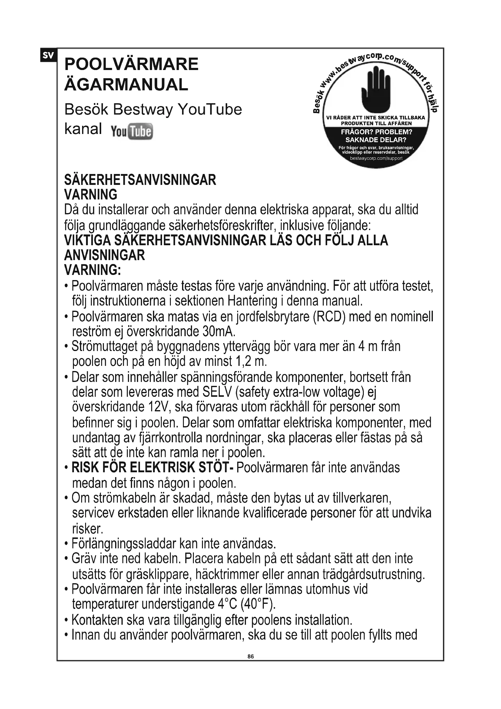 POOLVÄRMARE ÄGARMANUAL Besök Bestway YouTube kanal VI RÅDER ATT INTE SKICKA TILLBAKAPRODUKTEN TILL AFFÄRENFRÅGOR? PROBLEM?SAKNADE DELAR?För frågor och svar, bruksanvisningar,videoklipp eller reservdelar, besökbestwaycorp.com/support