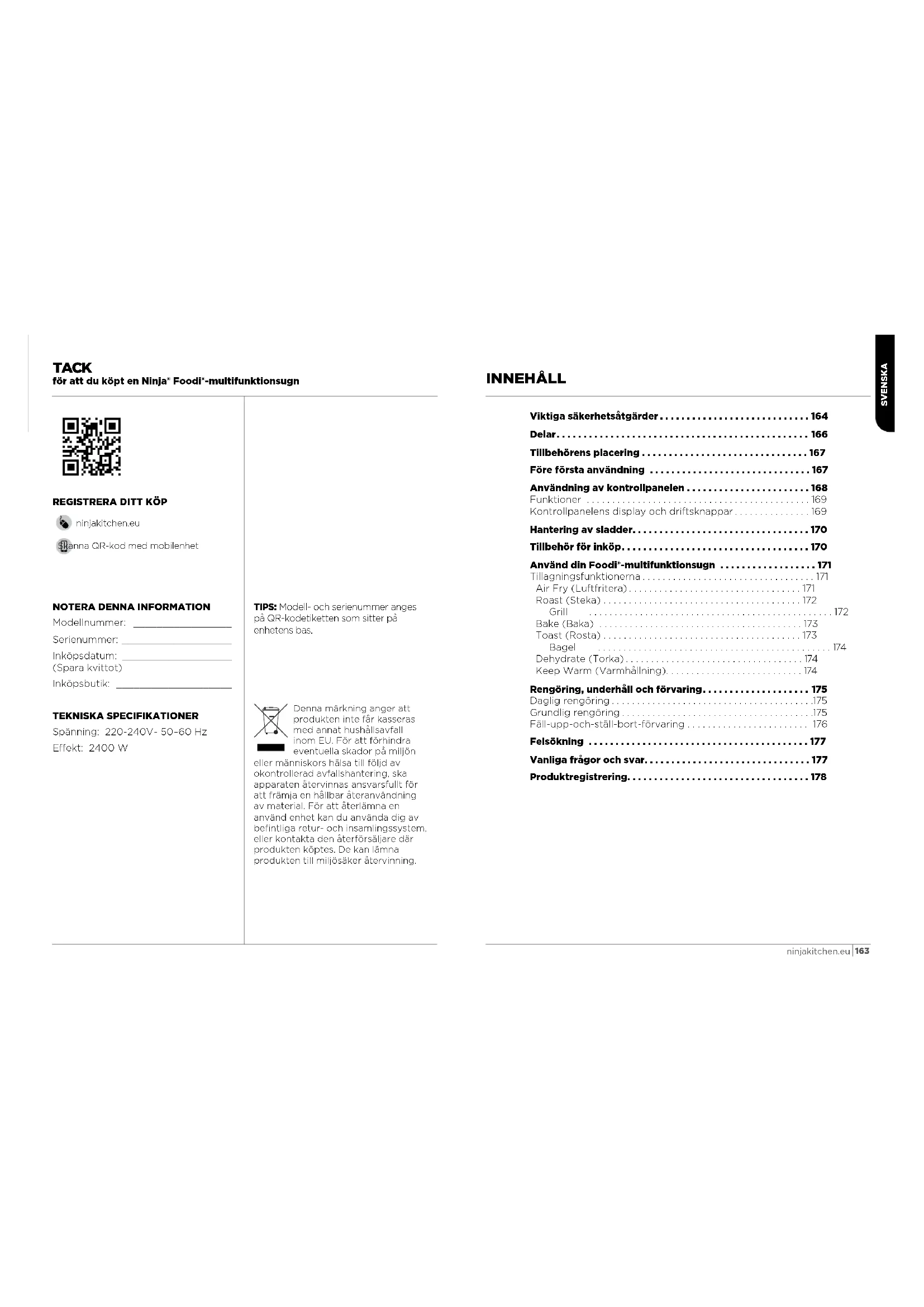 ninjakitchen.eu Skanna QR-kod med mobilenhet SVENSKA Denna märkning anger att produkten inte får kasseras med annat hushållsavfall inom EU. För att förhindra eventuella skador på miljön eller människors hälsa till följd av okontrollerad avfallshantering, ska apparaten återvinnas ansvarsfullt för att främja en hållbar återanvändning av material. För att återlämna en använd enhet kan du använda dig av befintliga retur- och insamlingssystem, eller kontakta den återförsäljare där produkten köptes. De kan lämna produkten till miljösäker återvinning.164 165 ninjakitchen.eu ninjakitchen.eu