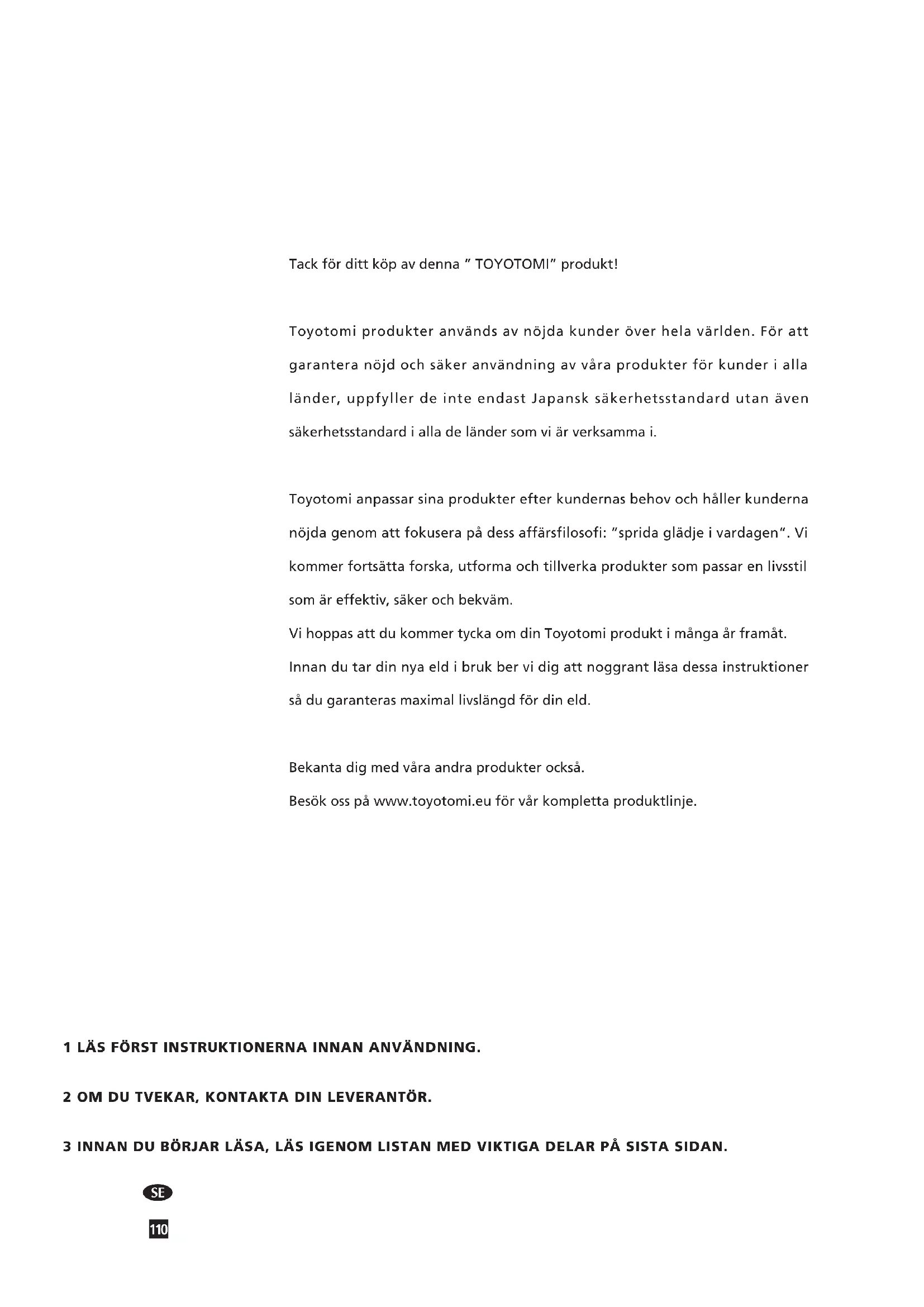 Tack för ditt köp av denna ” TOYOTOMI” produkt! Toyotomi produkter används av nöjda kunder över hela världen. För att garantera nöjd och säker användning av våra produkter för kunder i alla länder, uppfyller de inte endast Japansk säkerhetsstandard utan även säkerhetsstandard i alla de länder som vi är verksamma i. Toyotomi anpassar sina produkter efter kundernas behov och håller kunderna nöjda genom att fokusera på dess affärsfilosofi: ”sprida glädje i vardagen”. Vi kommer fortsätta forska, utforma och tillverka produkter som passar en livsstil som är effektiv, säker och bekväm. Vi hoppas att du kommer tycka om din Toyotomi produkt i många år framåt. Innan du tar din nya eld i bruk ber vi dig att noggrant läsa dessa instruktioner så du garanteras maximal livslängd för din eld. Bekanta dig med våra andra produkter också. Besök oss på www.toyotomi.eu för vår kompletta produktlinje. 1 LÄS FÖRST INSTRUKTIONERNA INNAN ANVÄNDNING. 2 OM DU TVEKAR, KONTAKTA DIN LEVERANTÖR. 3 POUR LIRE, DéPLIEz LA DERNIèRE PAGE. e e e e e e e e e e e e e 3 INNAN DU BÖRJAR LÄSA, LÄS IGENOM LISTAN MED VIKTIGA DELAR PÅ SISTA SIDAN.