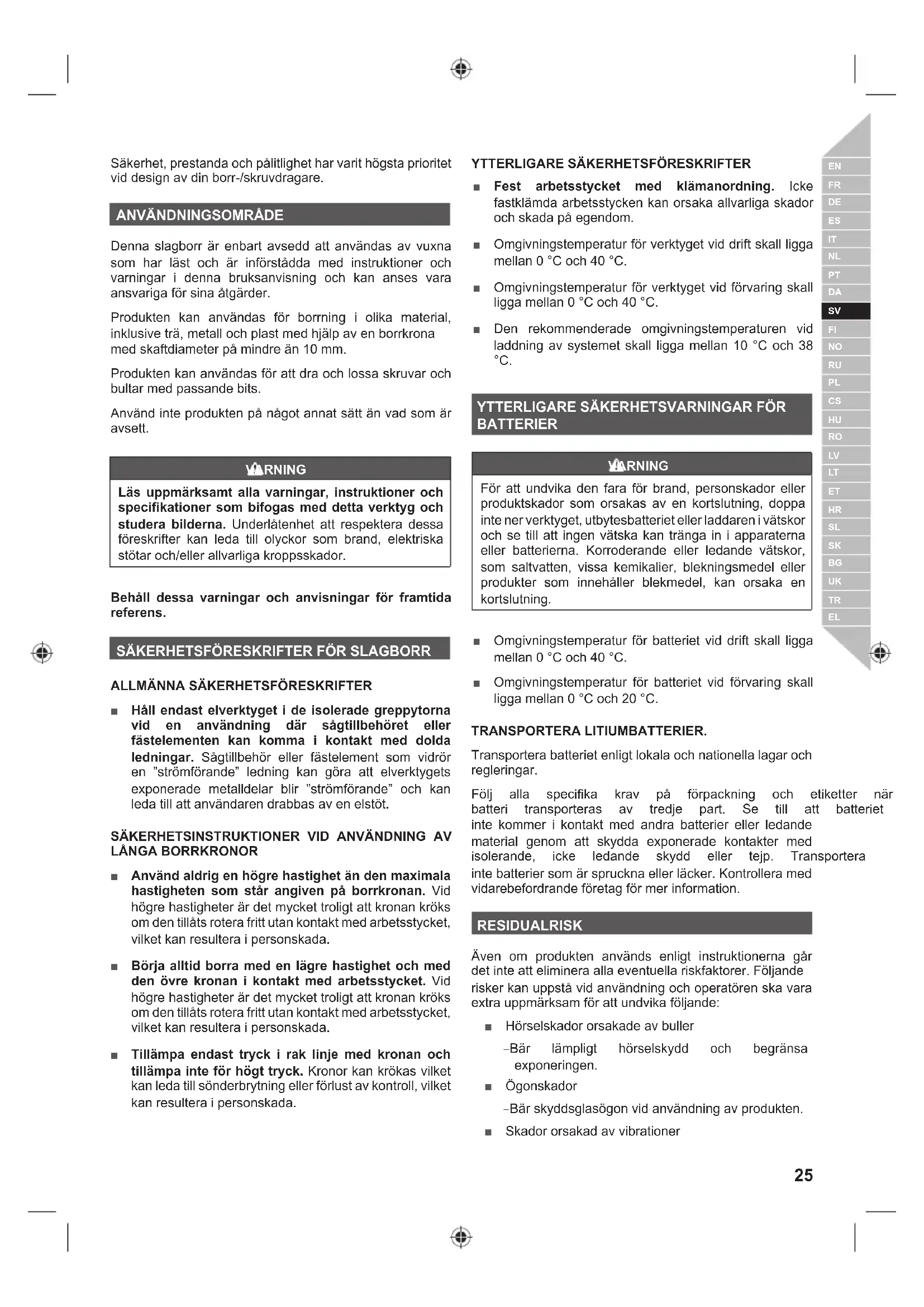 Denna slagborr är enbart avsedd att användas av vuxna som har läst och är införstådda med instruktioner och varningar i denna bruksanvisning och kan anses vara ansvariga för sina åtgärder. Produkten kan användas för borrning i olika material, LQNOXVLYHWUlPHWDOORFKSODVWPHGKMlOSDYHQERUUNURQD med skaftdiameter på mindre än 10 mm. Produkten kan användas för att dra och lossa skruvar och bultar med passande bits. Använd inte produkten på något annat sätt än vad som är avsett. VARNING Läs uppmärksamt alla varningar, instruktioner och specifikationer som bifogas med detta verktyg och studera bilderna. Underlåtenhet att respektera dessa föreskrifter kan leda till olyckor som brand, elektriska VW|WDURFKHOOHUDOOYDUOLJDNURSSVVNDGRU Behåll dessa varningar och anvisningar för framtida referens.