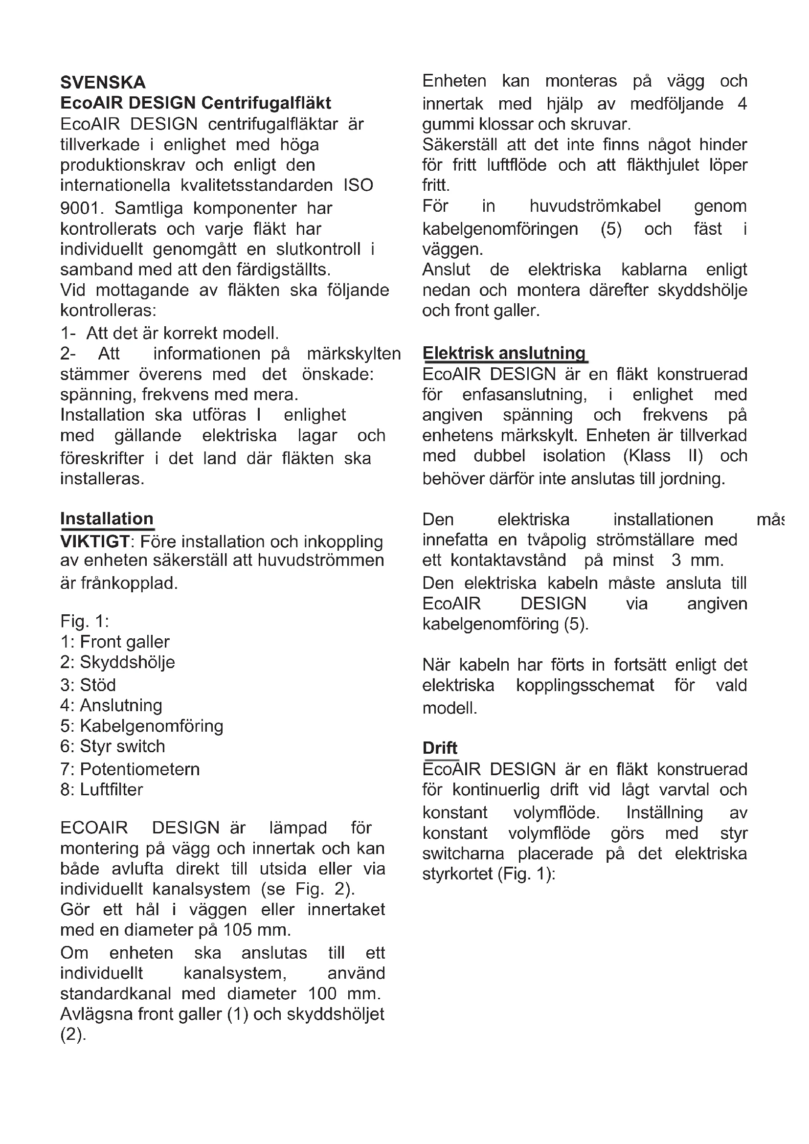 EcoAIR DESIGN ar en fläkt konstruerad für enfasanslutting, i enlighet med angiven spanning och frekvens på enchetens markskylt. Enheten ar tillverkad med dubbel isolation (Klass II) och behöver darüber inte anslutas till jordning.