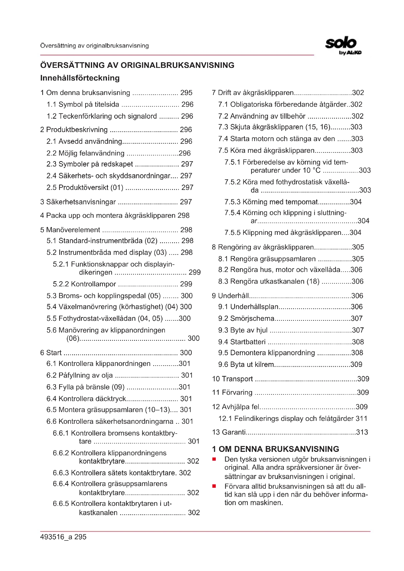 Bär alltid skyddshandskar under underhåll, skötsel och rengöring av maskinen! ANMÄRKNING Vänd dig till vår kundtjänst vid fel som inte finns med i den här tabellen eller vid fel som du inte själv kan åtgärda. Störning Orsak Åtgärd Motorn startar inte. Bränslebrist. Fyll på i tanken, kontrollera tankavluft- ningen, kontrollera bränslefiltret. Dåligt, förorenat bränsle; gam- malt bränsle i tanken. Använd alltid färskt bränsle från rena behållare; rengör förgasaren (kund- tjänstverkstad). Luftfiltret smutsigt. Rengör luftfiltret (se motortillverkarens bruksanvisning). Ingen tändgnista. Rengör tändstiftet, sätt ev. i ett nytt, kontrollera tändkabeln, kontrollera tänd- systemet (kundtjänstverkstad). För mycket bränsle i motorns brännkammare p.g.a. flera start- försök. Skruva ur tändstiftet och torka av det.SE 310 493516_a Avhjälpa fel Störning Orsak Åtgärd Startmotorn fungerar inte. Tomt eller svagt startbatteri. Ladda startbatteriet. Säkerhetsbrytaren på förarsätet ur funktion. Sitt ned korrekt på förarsätet; brytaren defekt. Säkerhetsbrytaren på bromspe- dalen ur funktion. Tryck ned bromspedalen helt. Klippanordningen har kopplats till. Koppla från klippanordningen. Säkring på startbatteriets pluska- bel (+). Kontrollera säkringen och byt ut den vid behov. Motoreffekten avtar. För högt eller för fuktigt gräs. Korrigera klipphöjden, skapa arbetsut- rymme för klippanordningen genom att köra tillbaka en kort bit. Utkastkanal/klippdäck igentäppt. Stäng av motorn och ta ur tändnings- nyckeln! Rengör utkastkanalen/klippdäcket. Luftfiltret smutsigt. Rengör luftfiltret (se motortillverkarens bruksanvisning). Inställningen av förgasaren stämmer inte. Låt kontrollera inställningen (kundtjänst- verkstad). Kniven kraftigt sliten. Byt ut kniven (kundtjänstverkstad). Körhastigheten för hög. Sänk körhastigheten. Åkgräsklipparen vi- brerar kraftigt. Klippanordningen är skadad. Kontrollera klippanordningen (kund- tjänstverkstad). Åkgräsklipparen kör inte iväg. Vid hydrostat-drivning: ingen kör- drivning. Ställ om bypasspaken till driftsläget (se Kapitel 7.3 "Skjuta åkgräsklipparen (15, 16)", sida303). Orent snitt. Kniven nött, slö. By kniv eller slipa den. Balansera knivar efter slipning (kundtjänstverkstad)! Fel klipphöjd. Korrigera klipphöjden. För lågt motorvarvtal. Ställ in maximalt motorvarvtal. Körhastigheten för hög. Sänk körhastigheten. Olika däcktryck mellan hjulen. Pumpa upp till rätt lufttryck. Läs av kor- rekt lufttryck på däcket. Gräsuppsamlaren fylls inte. Klipphöjden för lågt inställd. Korrigera klipphöjden. Gräset är fuktigt – för tungt för att transporteras av luftström- men. Skjut upp klippningen tills gräsytan har torkat. Kniven kraftigt sliten. Byt kniv. (Kundtjänstverkstad)493516_a 311 Avhjälpa fel Störning Orsak Åtgärd Gräsmattan för hög. Klippa gräsmattan 2ggr: