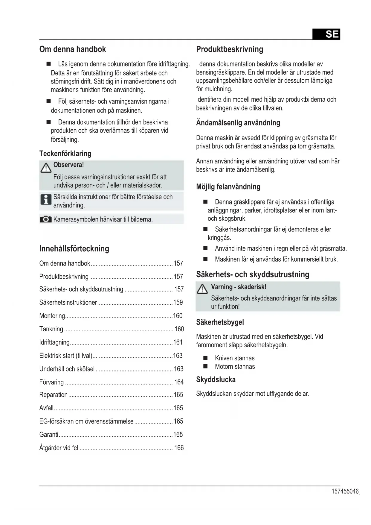 - Kontrollér kniven Kontaktvoreskundeservice,hvisfejlenikkendesiovenståendetabelellerduikkeselvkanudbedreden.SE 157455046_e Innehållsförteckning Om denna handbok ................................................... 157 Produktbeskrivning .................................................... 157 Säkerhets- och skyddsutrustning .............................. 157 Säkerhetsinstruktioner ............................................... 159 Montering ................................................................... 160 Tankning .................................................................... 160 Idrifttagning ................................................................ 161 Elektrisk start (tillval) .................................................. 163 Underhåll och skötsel ................................................ 163 Förvaring ................................................................... 164 Reparation ................................................................. 165 Avfall .......................................................................... 165 EG-försäkran om överensstämmelse ........................ 165 Garanti ....................................................................... 165 Åtgärder vid fel .......................................................... 166 Om denna handbok Läs igenom denna dokumentation före idrifttagning. Detta är en förutsättning för säkert arbete och störningsfri drift. Sätt dig in i manöverdonens och maskinens funktion före användning. Följ säkerhets- och varningsanvisningarna i dokumentationen och på maskinen. Denna dokumentation tillhör den beskrivna produkten och ska överlämnas till köparen vid försäljning. Teckenförklaring Observera! Följ dessa varningsinstruktioner exakt för att undvika person- och / eller materialskador. Särskilda instruktioner för bättre förståelse och användning. Kamerasymbolen hänvisar till bilderna. Produktbeskrivning I denna dokumentation beskrivs olika modeller av bensingräsklippare. En del modeller är utrustade med uppsamlingsbehållare och/eller är dessutom lämpliga för mulchning. Identieradinmodellmedhjälpavproduktbildernaoch beskrivningen av de olika tillvalen. Ändamålsenlig användning Denna maskin är avsedd för klippning av gräsmatta för privat bruk och får endast användas på torr gräsmatta. Annan användning eller användning utöver vad som här beskrivs är inte ändamålsenlig. Möjlig felanvändning Denna gräsklippare får ej användas i offentliga anläggningar, parker, idrottsplatser eller inom lant- och skogsbruk. Säkerhetsanordningar får ej demonteras eller kringgås. Använd inte maskinen i regn eller på våt gräsmatta. Maskinen får ej användas för kommersiellt bruk. Säkerhets- och skyddsutrustning Varning - skaderisk! Säkerhets- och skyddsanordningar får inte sättas ur funktion! Säkerhetsbygel Maskinen är utrustad med en säkerhetsbygel. Vid faromoment släpp säkerhetsbygeln. Kniven stannas Motorn stannas Skyddslucka Skyddsluckanskyddarmotutygandedelar.SE Översättning av originalbruksanvisning