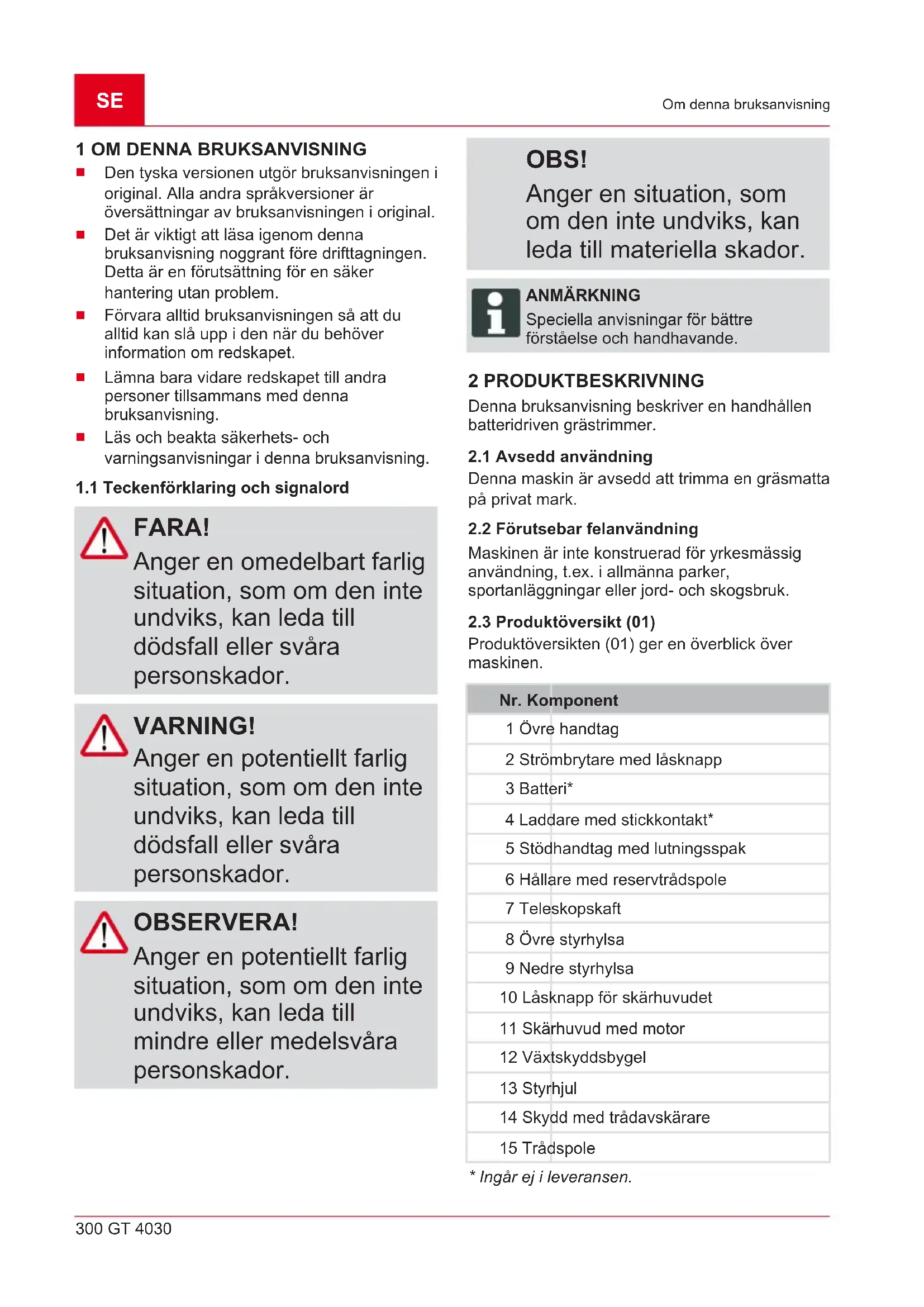 FARA! Anger en omedelbart farlig situation, som om den inte undviks, kan leda till dödsfall eller svåra personskador. VARNING! Anger en potentiellt farlig situation, som om den inte undviks, kan leda till dödsfall eller svåra personskador. OBSERVERA! Anger en potentiellt farlig situation, som om den inte undviks, kan leda till mindre eller medelsvåra personskador. OBS! Anger en situation, som om den inte undviks, kan leda till materiella skador. ANMÄRKNING Speciella anvisningar för bättre förståelse och handhavande. 2 PRODUKTBESKRIVNING Denna bruksanvisning beskriver en handhållen batteridriven grästrimmer.