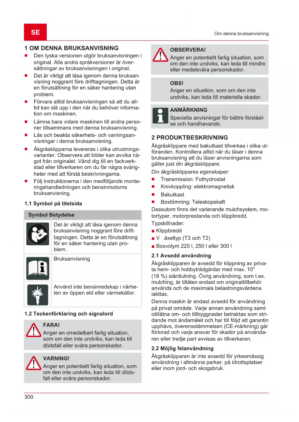 FARA! Anger en omedelbart farlig situation, som om den inte undviks, kan leda till dödsfall eller svåra personskador. VARNING! Anger en potentiellt farlig situation, som om den inte undviks, kan leda till döds- fall eller svåra personskador. OBSERVERA! Anger en potentiellt farlig situation, som om den inte undviks, kan leda till mindre eller medelsvåra personskador. OBS! Anger en situation, som om den inte undviks, kan leda till materiella skador. ANMÄRKNING Speciella anvisningar för bättre förståel- se och handhavande. 2 PRODUKTBESKRIVNING Åkgräsklippare med bakutkast tillverkas i olika ut- föranden. Kontrollera alltid när du läser i denna bruksanvisning att du läser anvisningarna som gäller just din åkgräsklippare. Din åkgräsklippares egenskaper: