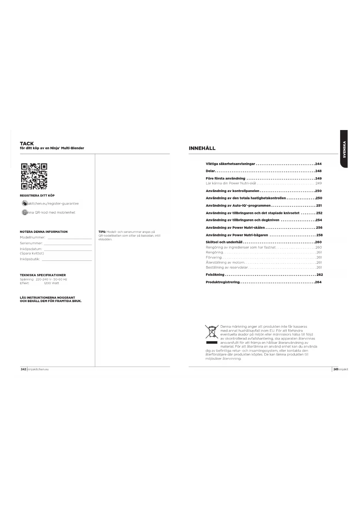 ninjakitchen.eu/register-guarantee Skanna QR-kod med mobilenhet SVENSKA Denna märkning anger att produkten inte får kasseras med annat hushållsavfall inom EU. För att förhindra eventuella skador på miljön eller människors hälsa till följd av okontrollerad avfallshantering, ska apparaten återvinnas ansvarsfullt för att främja en hållbar återanvändning av material. För att återlämna en använd enhet kan du använda dig av befintliga retur- och insamlingssystem, eller kontakta den återförsäljare där produkten köptes. De kan lämna produkten till miljösäker återvinning.SPARA DESSA INSTRUKTIONER