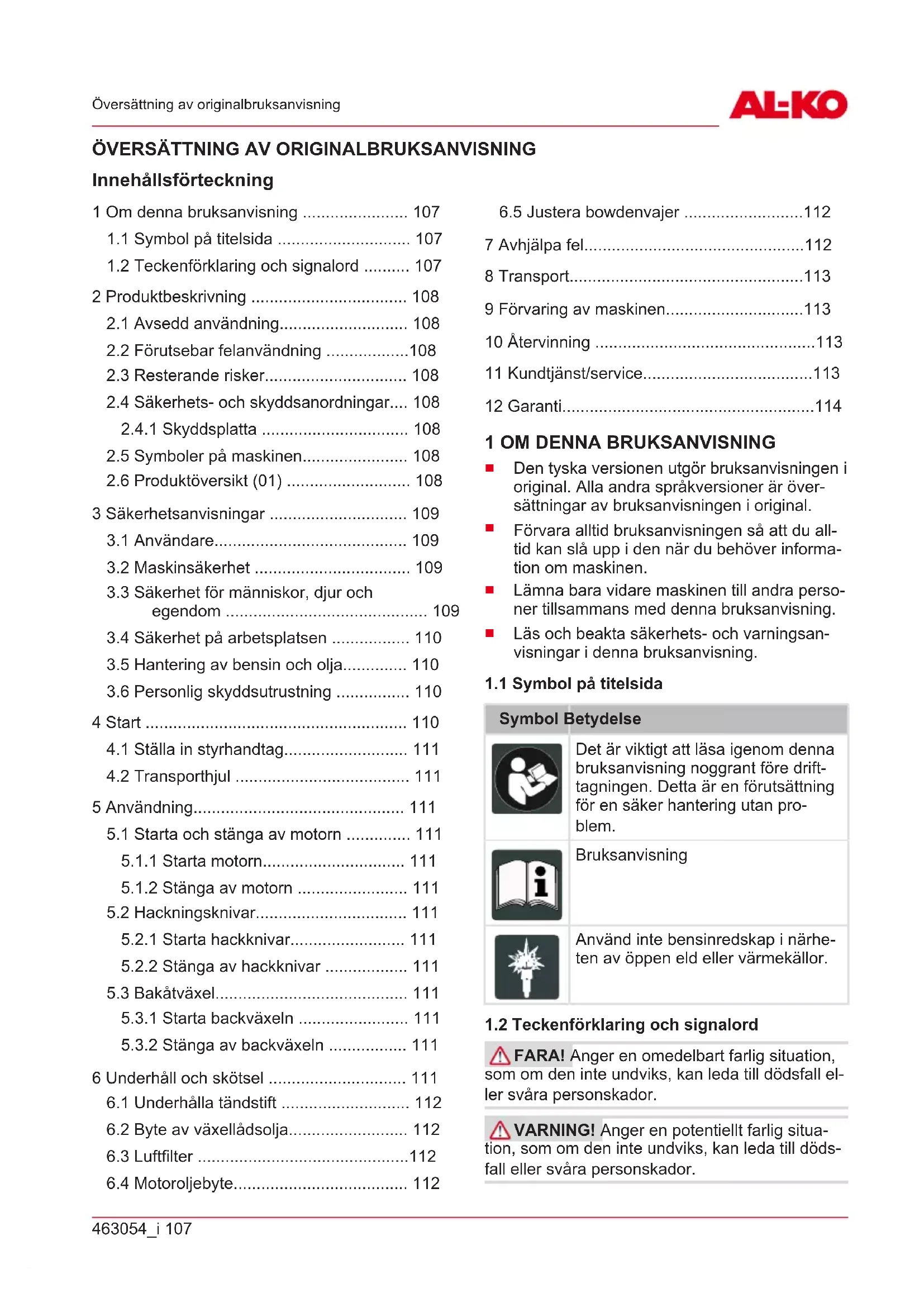 Produktöversikten (01) ger en överblick över ma- skinen. Nr. Komponent 1 Kopplingsspak 2 Gasreglage 3 Backspak 4 Startlina 5 Transporthjul 6 Hackningsknivar 7 Skyddsplatta 8 Skyddsplåt 9 Bromssporre463054_i 109 Säkerhetsanvisningar 3 SÄKERHETSANVISNINGAR FARA! Livsfara och fara för mycket all- varliga personskador! Bristande kännedom om säkerhetsanvisningar och bruksanvisningar kan leda till allvarliga personskador och t.o.m. döds- fall.