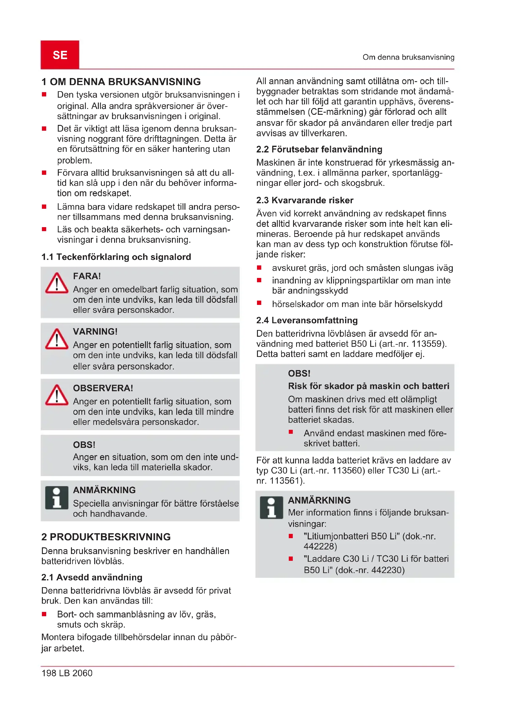 Den batteridrivna lövblåsen är avsedd för an- vändning med batteriet B50 Li (art.-nr. 113559). Detta batteri samt en laddare medföljer ej. OBS! Risk för skador på maskin och batteri Om maskinen drivs med ett olämpligt batteri finns det risk för att maskinen eller batteriet skadas.
