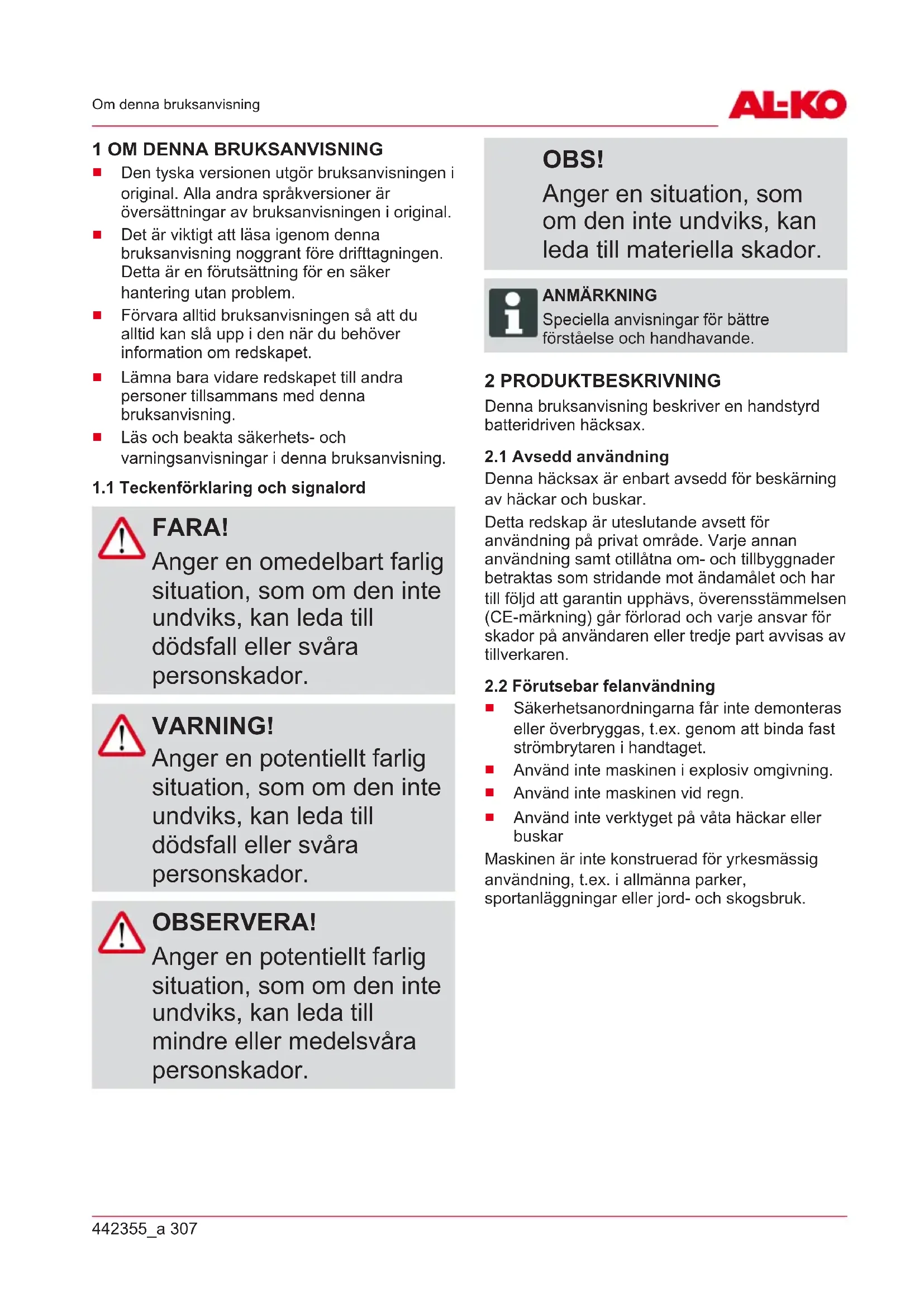 FARA! Anger en omedelbart farlig situation, som om den inte undviks, kan leda till dödsfall eller svåra personskador. VARNING! Anger en potentiellt farlig situation, som om den inte undviks, kan leda till dödsfall eller svåra personskador. OBSERVERA! Anger en potentiellt farlig situation, som om den inte undviks, kan leda till mindre eller medelsvåra personskador. OBS! Anger en situation, som om den inte undviks, kan leda till materiella skador. ANMÄRKNING Speciella anvisningar för bättre förståelse och handhavande. 2 PRODUKTBESKRIVNING Denna bruksanvisning beskriver en handstyrd batteridriven häcksax.