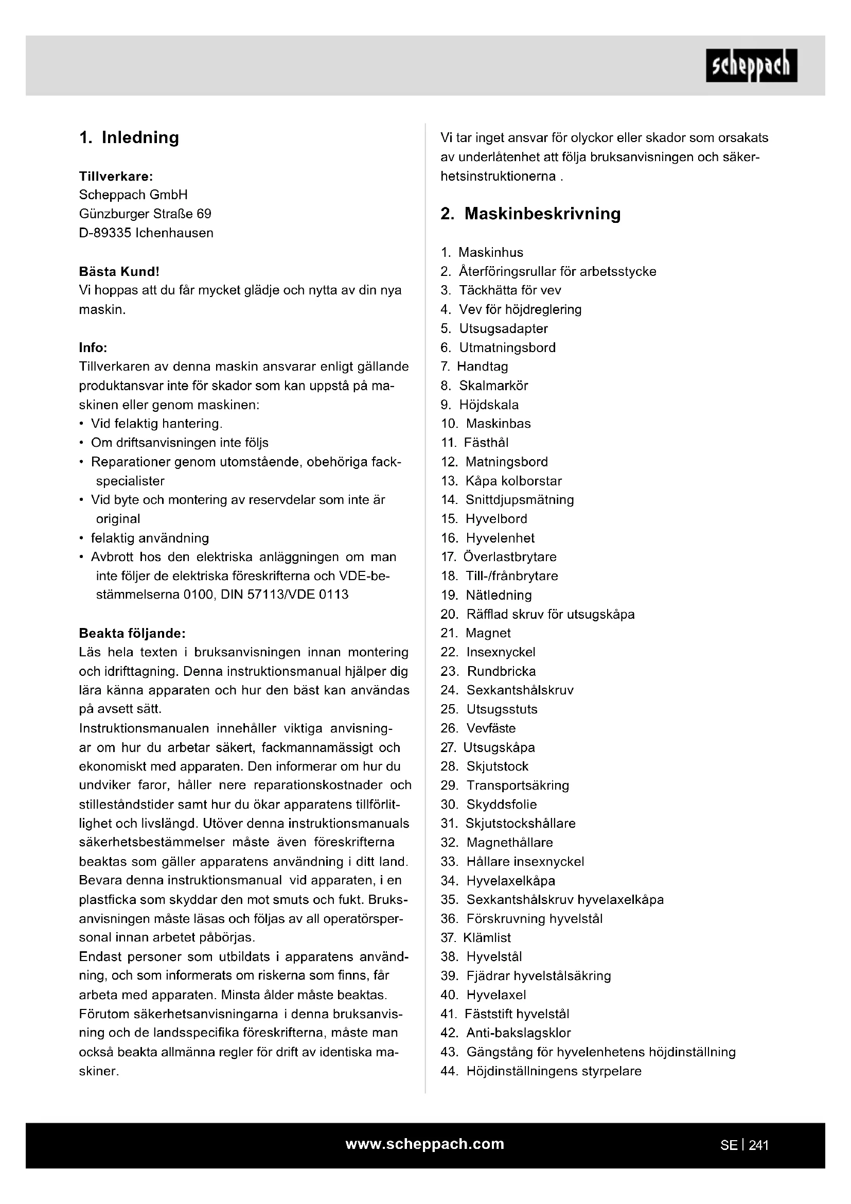 Tillverkare: Scheppach GmbH Günzburger Straße 69 D-89335 Ichenhausen Bästa Kund! Vi hoppas att du får mycket glädje och nytta av din nya maskin. Info: Tillverkaren av denna maskin ansvarar enligt gällande produktansvar inte för skador som kan uppstå på ma- skinen eller genom maskinen: