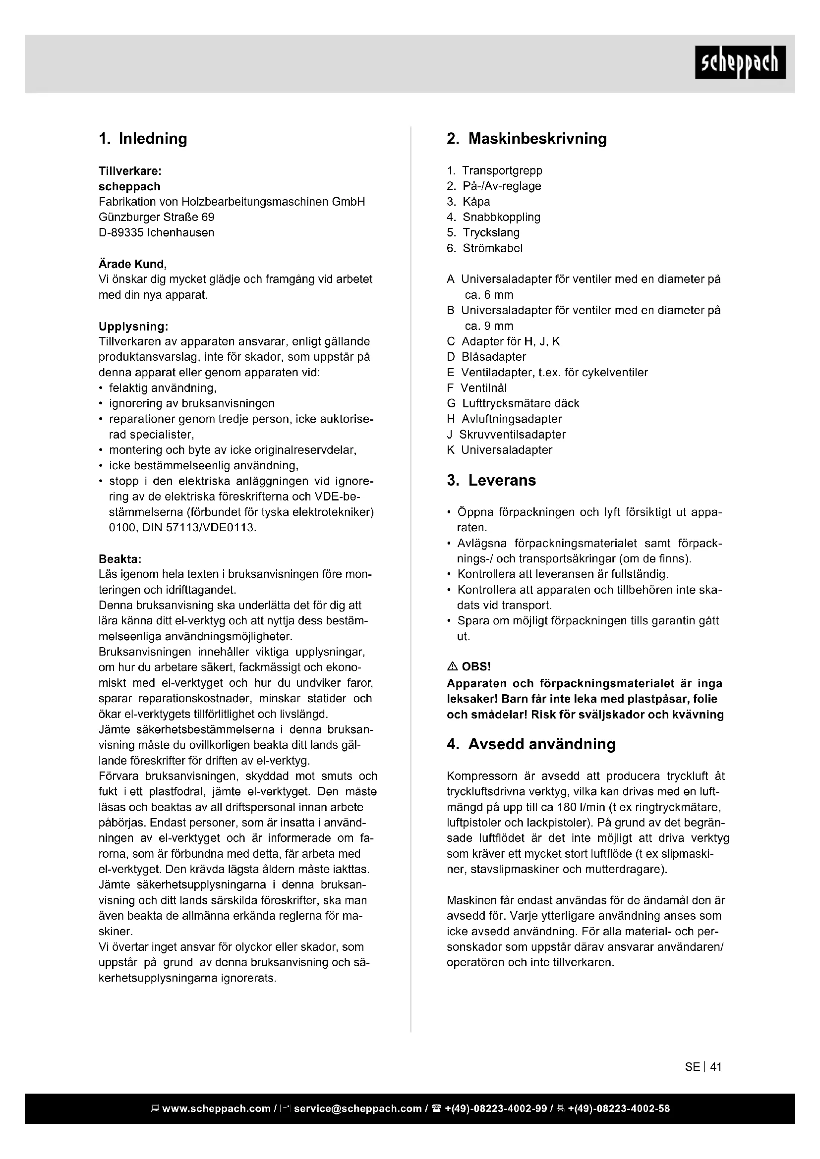 m Obs! Vid användning av elektriska verktyg ska följande säkerhets åtgärder iakttas som skydd mot elchock, skade- och brandrisk. Läs alla dessa anvis- ningar innan du använder det elektriska verktyget, och spara säkerhetsanvisningarna. Arbeta säkert 1 Håll ordning på arbetsområdet – Ett stökigt arbetsområde kan ha olyckor som följd. 2 Ta hänsyn till omgivningens inytande – Utsätt inte det elektriska verktyget för regn, – Använd inte elektriska verktyg i fuktig eller blöt miljö. Risk för elchock! – Sörj för god belysning av arbetsområdet. – Använd inte elektriska verktyg om brand-eller explosionsrisk består. 3 Skydda dig mot elchock – Undvik kroppskontakt med jordade delar (t ex rör, element, elektriska spisar, kylapparater). 4 Håll barn borta! – Låt inte andra personer röra vid verktyget och kabeln, håll dem borta från arbetsområdet. 5 Förvara elektriska verktyg på ett säkert ställe när de inte används. – När elektriska verktyg inte är i bruk bör de för- varas på ett torrt, högt beläget eller avstängt utrymme, utom räckhåll för barn. 6 Överlasta inte det elektriska verktyget. – De fungerar bättre och säkrare inom det angivna prestandaområdet. 7 Bär lämplig klädsel – Bär ingen vid klädsel eller smycken, de kan fast- na i rörliga delar. – Vid arbete i det fria rekommenderas gummi- handskar och halkfria skor. – Bär hårnät om du har långt hår. 8 Använd inte kabeln för ändamål som den inte är avsedd för. – Använd inte kabeln för att dra stickkontakten ur eluttaget. Skydda kabeln mot värme,olja och skarpa kanter. 9 Vårda dina verktyg omsorgsfullt – Håll kompressorn ren för ett gott och säkert arbete. – Följ underhållsföreskrifterna. – Kontrollera regelbundet det elektriska verkty- gets anslutningsledning och låt teknisk perso- nal ersätta den om den är skadad. www.scheppach.com / service@scheppach.com / +(49)-08223-4002-99 / +(49)-08223-4002-58