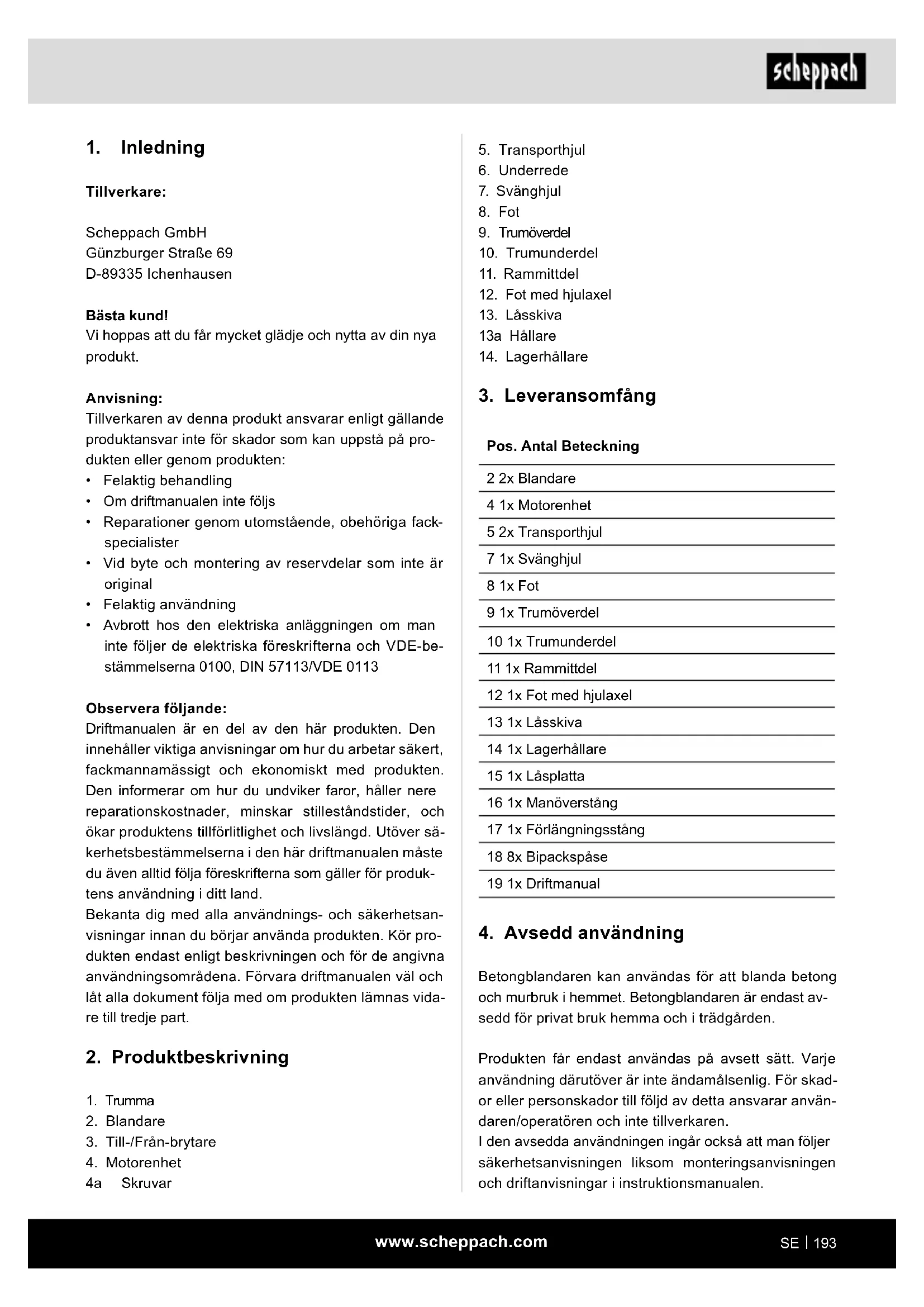 Pos. Antal Beteckning 2 2x Blandare 4 1x Motorenhet 5 2x Transporthjul 7 1x Svänghjul 8 1x Fot 9 1x Trumöverdel 10 1x Trumunderdel 11 1x Rammittdel 12 1x Fot med hjulaxel 13 1x Låsskiva 14 1x Lagerhållare 15 1x Låsplatta 16 1x Manöverstång 17 1x Förlängningsstång 18 8x Bipackspåse 19 1x Driftmanual