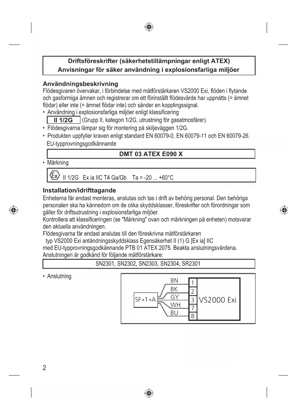 - Märkning II 1/2G Ex ia IIC T4 Ga/Gb Ta = -20 ... +60°C Installation/idrifttagande Enheterna får endast monteras, anslutas och tas i drift av behörig personal. Den behöriga personalen ska ha kännedom om de olika skyddsklasser, föreskrifter och förordningar som gäller för driftsutrustning i explosionsfarliga miljöer. Kontrollera att klassificeringen (se "Märkning" ovan och märkningen på enheten) motsvarar den aktuella användningen. Flödesgivarna får endast anslutas till den föreskrivna mätförstärkaren typ VS2000 Exi antändningsskyddsklass Egensäkerhet II (1) G [Ex ia] IIC med EU-typprovningsgodkännande PTB 01 ATEX 2075. Beakta anslutningsvärdena. Anslutningen är godkänd för följande mätförstärkare: SN2301, SN2302, SN2303, SN2304, SR2301