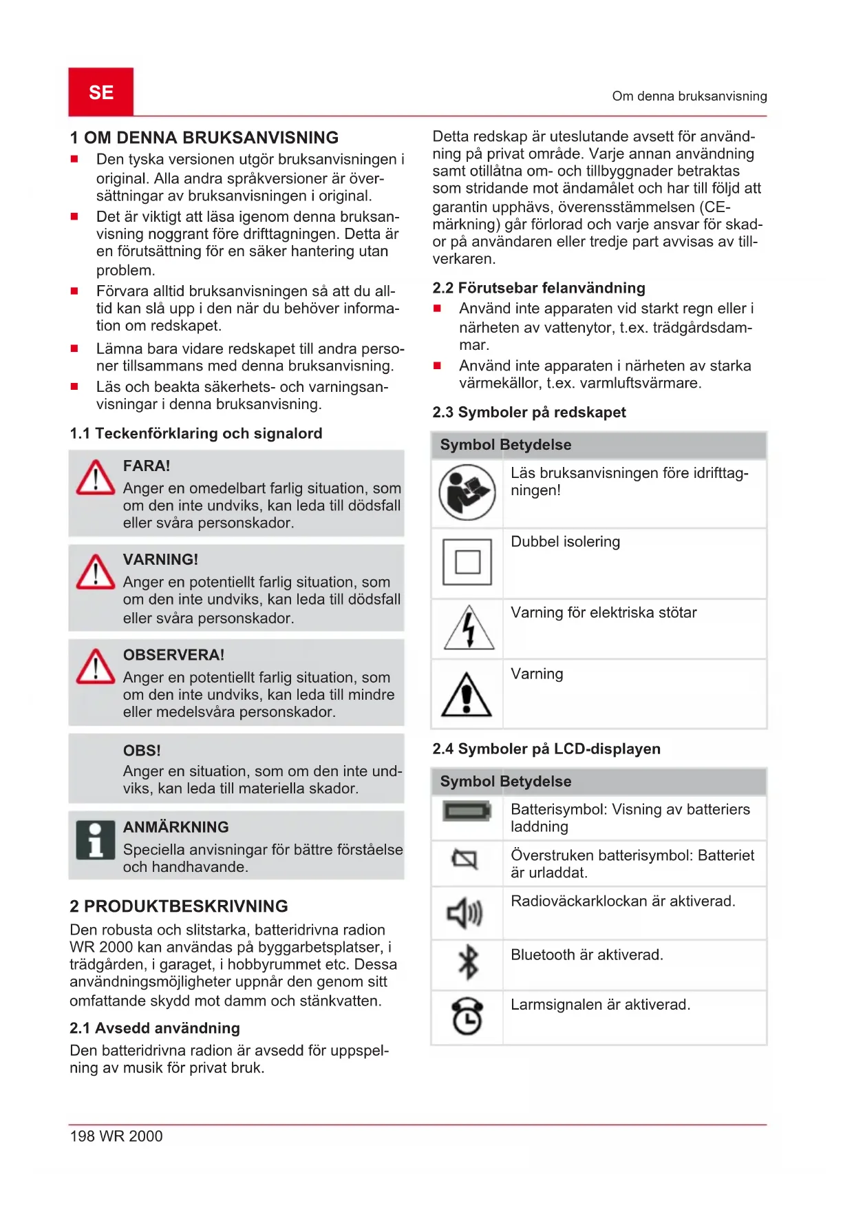 FARA! Anger en omedelbart farlig situation, som om den inte undviks, kan leda till dödsfall eller svåra personskador. VARNING! Anger en potentiellt farlig situation, som om den inte undviks, kan leda till dödsfall eller svåra personskador. OBSERVERA! Anger en potentiellt farlig situation, som om den inte undviks, kan leda till mindre eller medelsvåra personskador. OBS! Anger en situation, som om den inte und- viks, kan leda till materiella skador. ANMÄRKNING Speciella anvisningar för bättre förståelse och handhavande. 2 PRODUKTBESKRIVNING Den robusta och slitstarka, batteridrivna radion WR2000 kan användas på byggarbetsplatser, i trädgården, i garaget, i hobbyrummet etc. Dessa användningsmöjligheter uppnår den genom sitt omfattande skydd mot damm och stänkvatten.