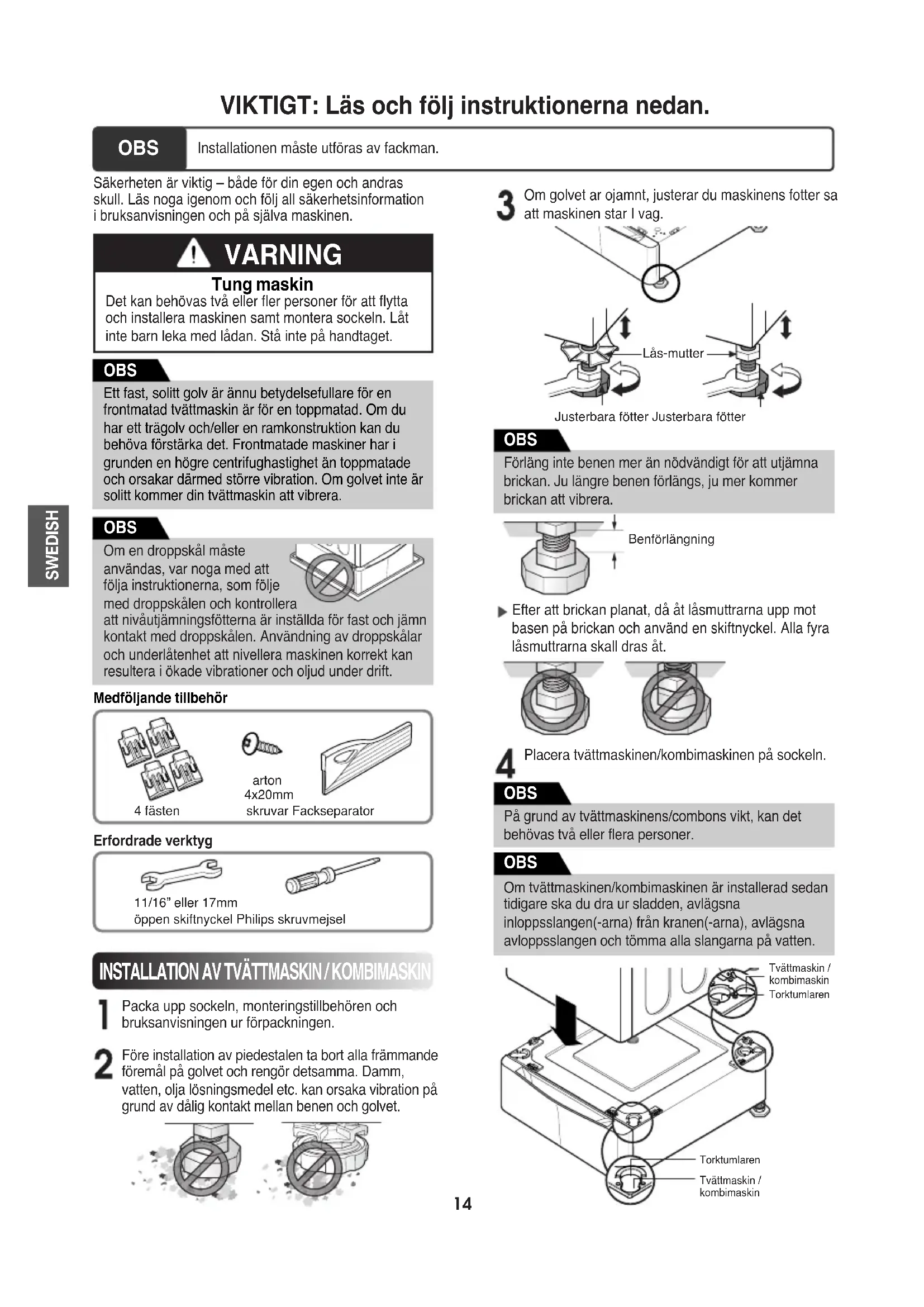 dass die Lüftungsschraube gelockert werden kann. Lockern Sie diese Schraube und ziehen vorsichtig den Austrittsabzug vom Trockneraustrittsagzug ab. Justierbare Gerätefüße Justierbare Gerätefüße Justierbare Gerätefüße Befestigun smutter Stellen Sie trockner am gewunschten Platrz auf. Gerät und Sockel müssen auf einem festen und bündigen Untergrund stehen, der für den Einsatz geeignet ist. Regulieren Sie die Füße des Geräts und Sockels mit Schraubenschlüssel. Danach justieren Sie die Sicherungsmutter in Richtung Sockel, während Sie den Sockelfuß unter Einsatz eines Schraubenschlüssels halten. HINWEIS Falls die Schrauben nicht fest installiert sind, können Lärm und Vibrationen verursacht werden. HINWEIS T-Klemme Halterung GERMAN14 SWEDISHTvättmaskin /kombimaskinTorktumlarenTorktumlarenTvättmaskin /kombimaskinLås-mutterJusterbara fötter Justerbara fötterBenförlängning VIKTIGT: Läs och följ instruktionerna nedan. OBS Installationen måste utföras av fackman. Säkerheten är viktig – både för din egen och andrasskull. Läs noga igenom och följ all säkerhetsinformationi bruksanvisningen och på själva maskinen.Packa upp sockeln, monteringstillbehören ochbruksanvisningen ur förpackningen.Placera tvättmaskinen/kombimaskinen på sockeln. VARNING Tung maskin Det kan behövas två eller fler personer för att flyttaoch installera maskinen samt montera sockeln. Låtinte barn leka med lådan. Stå inte på handtaget. Ett fast, solitt golv är ännu betydelsefullare för enfrontmatad tvättmaskin är för en toppmatad. Om duhar ett trägolv och/eller en ramkonstruktion kan dubehöva förstärka det. Frontmatade maskiner har igrunden en högre centrifughastighet än toppmatadeoch orsakar därmed större vibration. Om golvet inte ärsolitt kommer din tvättmaskin att vibrera.Före installation av piedestalen ta bort alla främmandeföremål på golvet och rengör detsamma. Damm,vatten, olja lösningsmedel etc. kan orsaka vibration pågrund av dålig kontakt mellan benen och golvet.Efter att brickan planat, då åt låsmuttrarna upp motbasen på brickan och använd en skiftnyckel. Alla fyralåsmuttrarna skall dras åt.Om golvet ar ojamnt, justerar du maskinens fotter saatt maskinen star I vag. OBS Om en droppskål måsteanvändas, var noga med attfölja instruktionerna, som följemed droppskålen och kontrolleraatt nivåutjämningsfötterna är inställda för fast och jämnkontakt med droppskålen. Användning av droppskålaroch underlåtenhet att nivellera maskinen korrekt kanresultera i ökade vibrationer och oljud under drift. OBS Förläng inte benen mer än nödvändigt för att utjämnabrickan. Ju längre benen förlängs, ju mer kommerbrickan att vibrera. OBS På grund av tvättmaskinens/combons vikt, kan detbehövas två eller flera personer. OBS Om tvättmaskinen/kombimaskinen är installerad sedantidigare ska du dra ur sladden, avlägsnainloppsslangen(-arna) från kranen(-arna), avlägsnaavloppsslangen och tömma alla slangarna på vatten. OBS Medföljande tillbehör4 fästenarton4x20mmskruvar FackseparatorErfordrade verktyg11/16” eller 17mmöppen skiftnyckel Philips skruvmejsel