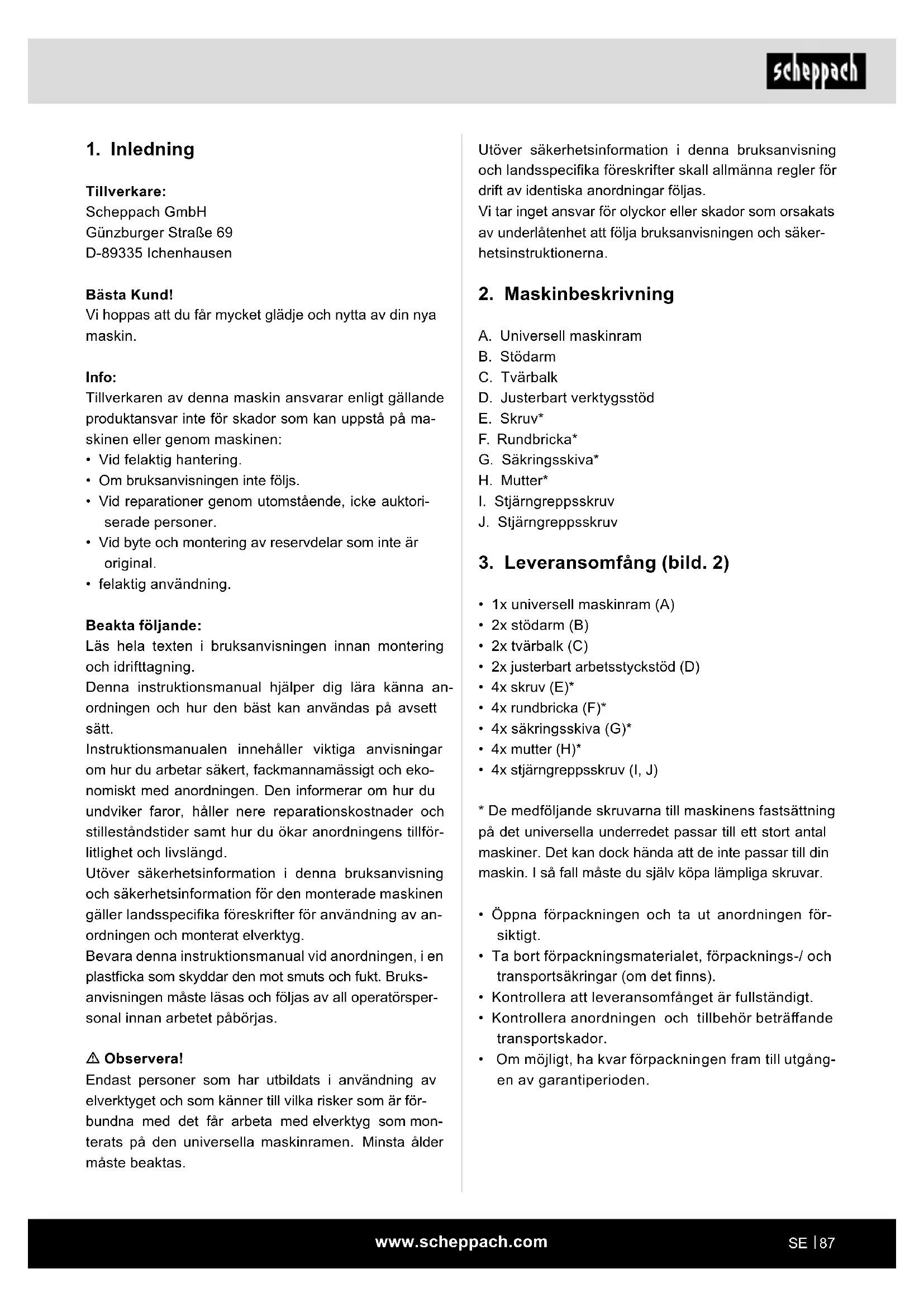 - felaktig användning. Beakta följande: Läs hela texten i bruksanvisningen innan montering och idrifttagning. Denna instruktionsmanual hjälper dig lära känna an- ordningen och hur den bäst kan användas på avsett sätt. Instruktionsmanualen innehåller viktiga anvisningar om hur du arbetar säkert, fackmannamässigt och eko- nomiskt med anordningen. Den informerar om hur du undviker faror, håller nere reparationskostnader och stilleståndstider samt hur du ökar anordningens tillför- litlighet och livslängd. Utöver säkerhetsinformation i denna bruksanvisning och säkerhetsinformation för den monterade maskinen gäller landsspecika föreskrifter för användning av an- ordningen och monterat elverktyg. Bevara denna instruktionsmanual vid anordningen, i en plastcka som skyddar den mot smuts och fukt. Bruks- anvisningen måste läsas och följas av all operatörsper- sonal innan arbetet påbörjas. m Observera! Endast personer som har utbildats i användning av elverktyget och som känner till vilka risker som är för- bundna med det får arbeta med elverktyg som mon- terats på den universella maskinramen. Minsta ålder måste beaktas.www.scheppach.com