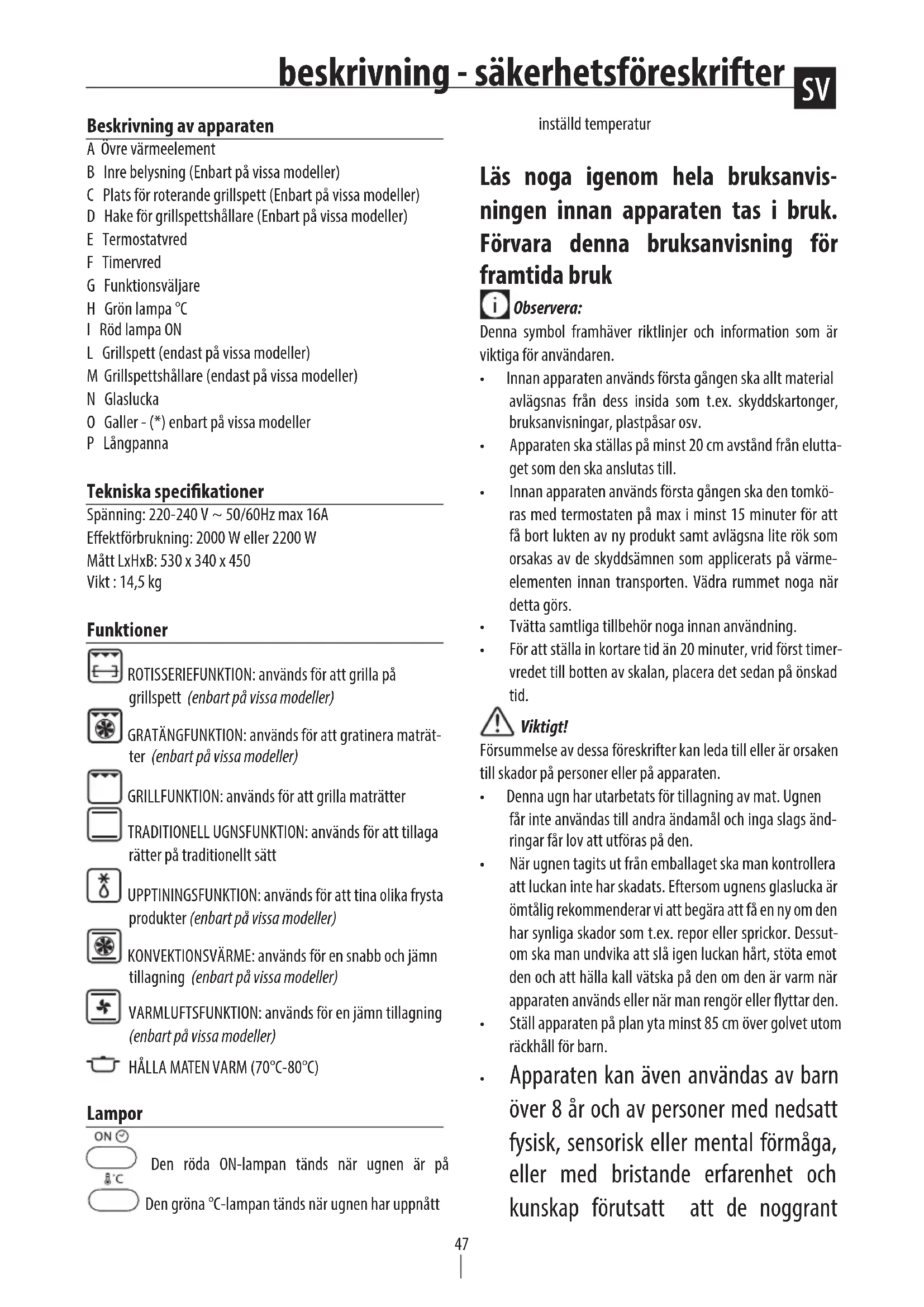 Beskrivning av apparaten A Övre värmeelement B Inre belysning (Enbart på vissa modeller) C Plats för roterande grillspett (Enbart på vissa modeller) D Hake för grillspettshållare (Enbart på vissa modeller) E Termostatvred F Timervred G Funktionsväljare H Grön lampa °C I Röd lampa ON L Grillspett (endast på vissa modeller) M Grillspettshållare (endast på vissa modeller) N Glaslucka O Galler - (*) enbart på vissa modeller P Långpanna Tekniska specikationer Spänning: 220-240 V ~ 50/60Hz max 16A Eektförbrukning: 2000 W eller 2200 W Mått LxHxB: 530 x 340 x 450 Vikt : 14,5 kg Funktioner ROTISSERIEFUNKTION: används för att grilla på grillspett (enbart på vissa modeller) GRATÄNGFUNKTION: används för att gratinera maträt- ter (enbart på vissa modeller) GRILLFUNKTION: används för att grilla maträtter TRADITIONELL UGNSFUNKTION: används för att tillaga rätter på traditionellt sätt UPPTININGSFUNKTION: används för att tina olika frysta produkter (enbart på vissa modeller) KONVEKTIONSVÄRME: används för en snabb och jämn tillagning (enbart på vissa modeller) VARMLUFTSFUNKTION: används för en jämn tillagning (enbart på vissa modeller) HÅLLA MATEN VARM (70°C-80°C) Lampor Den röda ON-lampan tänds när ugnen är på Den gröna °C-lampan tänds när ugnen har uppnått inställd temperatur Läs noga igenom hela bruksanvis- ningen innan apparaten tas i bruk. Förvara denna bruksanvisning för framtida bruk Observera: Denna symbol framhäver riktlinjer och information som är viktiga för användaren.