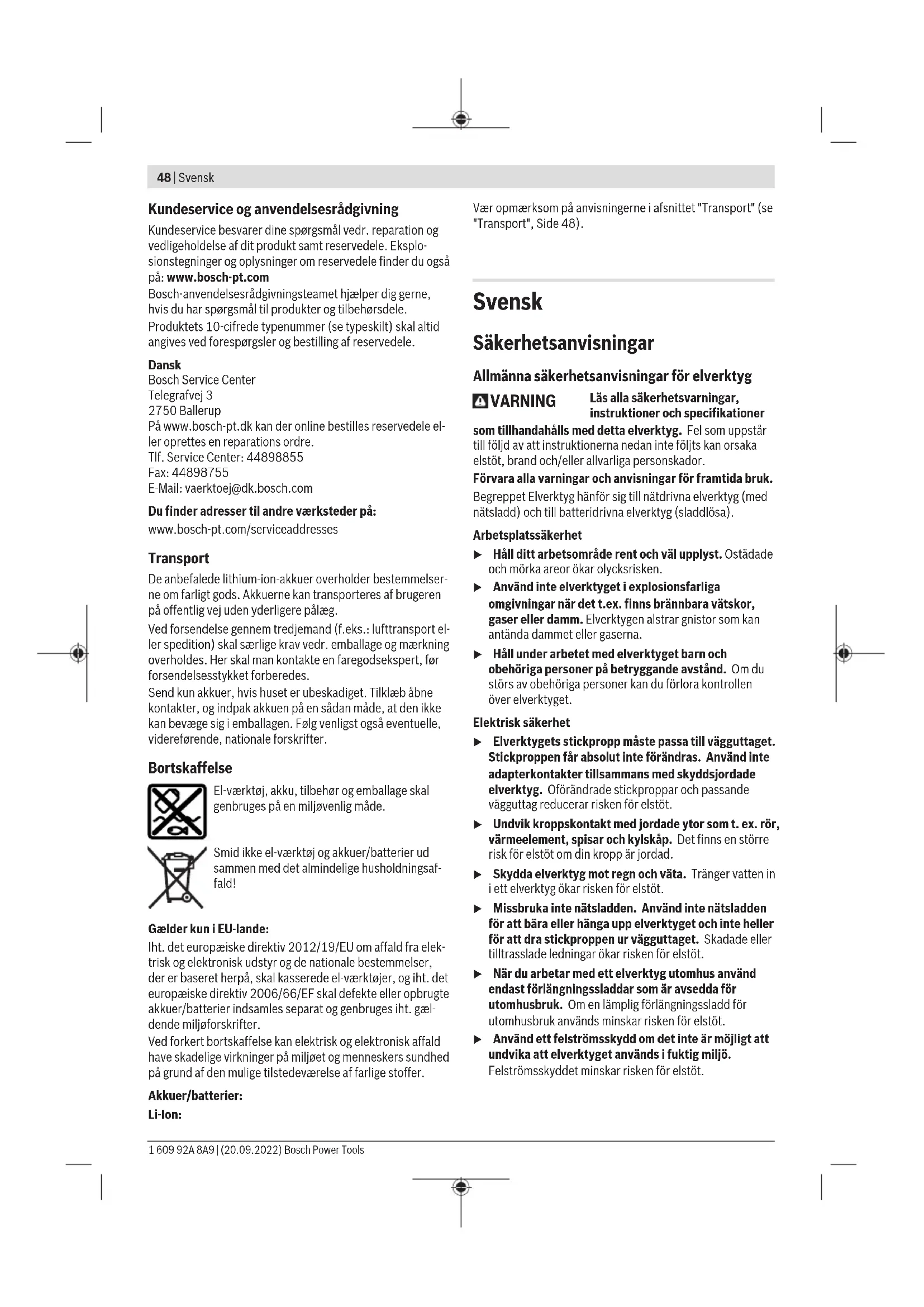 0,7 Aluminium 200 2,0 Smøring/køling af stempel Stemplets levetid(8) forlænges ved at bruge et smøremid- del med god kølefunktion (f. eks. skæreolie). Påfør et smøremiddelspor på oversiden af pladen langs med den planlagte snitlinje. Skæring efter markering eller vha. skabelon Ligesnit er nemmere at lave, hvis el‑værktøjet føres langs med en lineal. Konturer kan skæres ved at føre el-værktøjet langs med en skabelon. Til snit indefra og ud skal der forbores med en diameter på 22mm. Temperaturafhængig overbelastningsbeskyttelse Ved korrekt brug kan el-værktøjet ikke blive overbelastet. Hvis belastningen bliver for stor, eller det tilladte temperatu- rområde overskrides, reduceres slagtallet, eller el-værktøjet slukker. Når slagtallet er reduceret kører el-værktøjet først, når den tilladte batteritemperatur atter er opnået med fuldt slagtal. Ved automatisk frakobling slukker du el-værktøjet, lader akkuen køle af og tænder el-værktøjet igen. Vedligeholdelse og service Vedligeholdelse og rengøring u Tag altid akkuen ud af el‑værktøjet, før der arbejdes på el‑værktøjet (f.eks. vedligeholdelse, værktøjsskift osv.) samt før det transporteres og lægges til opbeva- ring. Utilsigtet aktivering af start-stop-kontakten er for- bundet med kvæstelsesfare. u El‑værktøj og el‑værktøjets ventilationsåbninger skal altid holdes rene for at sikre et godt og sikkert ar- bejde. Rengør stempel(8) og matrice(9), og smør med olie hver 3.driftstime. Udskift stempel og matrice i god tid, hvis de er slidte, da kun skarpt værktøj kan sikre et godt skæreresultat og skåne el- værktøjet. Stemplet(8) og matricen(9) må ikke efterslibes. Udskiftning af matrice Skru fingerskruen(11) ud af matriceholderen(7). Tag matricen(9) ud. Rengør om nødvendigt matriceholderen(7). Sæt en ny matrice(9), som er smurt godt med olie, i matriceholderen. Kontroller, at den flade side vender rigtigt. Skru fingerskruen(11) på igen med påsat gummiring(10). Spænd skruen mod gummiringens modstand (3−4Nm) ved hjælp af en unbrakonøgle. Udskiftning af stempel Løsn skruen(4) til matriceholderen, og træk matriceholderen(7) helt ud af huset. Skub stemplet(8) sideværts ud af holderen, og træk det nedad og ud. Sæt et nyt stempel(8), som er smurt godt med olie, i hol- derens not, og centrer det. Skub matriceholderen(7) forsigtigt hen over stemplet og til- bage i huset. Drej matriceholderen til en af de tre mulige po- sitioner afhængigt af den ønskede snitretning. Spænd skruen(4) til matriceholderen godt fast. Bosch Power Tools 1 609 92A 8A9 | (20.09.2022)48 | Svensk Kundeservice og anvendelsesrådgivning Kundeservice besvarer dine spørgsmål vedr. reparation og vedligeholdelse af dit produkt samt reservedele. Eksplo- sionstegninger og oplysninger om reservedele finder du også på: www.bosch-pt.com Bosch-anvendelsesrådgivningsteamet hjælper dig gerne, hvis du har spørgsmål til produkter og tilbehørsdele. Produktets 10‑cifrede typenummer (se typeskilt) skal altid angives ved forespørgsler og bestilling af reservedele. Dansk Bosch Service Center Telegrafvej 3 2750 Ballerup På www.bosch-pt.dk kan der online bestilles reservedele el- ler oprettes en reparations ordre. Tlf. Service Center: 44898855 Fax: 44898755 E-Mail: vaerktoej@dk.bosch.com Du finder adresser til andre værksteder på: www.bosch-pt.com/serviceaddresses Transport De anbefalede lithium-ion-akkuer overholder bestemmelser- ne om farligt gods. Akkuerne kan transporteres af brugeren på offentlig vej uden yderligere pålæg. Ved forsendelse gennem tredjemand (f.eks.: lufttransport el- ler spedition) skal særlige krav vedr. emballage og mærkning overholdes. Her skal man kontakte en faregodsekspert, før forsendelsesstykket forberedes. Send kun akkuer, hvis huset er ubeskadiget. Tilklæb åbne kontakter, og indpak akkuen på en sådan måde, at den ikke kan bevæge sig i emballagen. Følg venligst også eventuelle, videreførende, nationale forskrifter. Bortskaffelse El-værktøj, akku, tilbehør og emballage skal genbruges på en miljøvenlig måde. Smid ikke el-værktøj og akkuer/batterier ud sammen med det almindelige husholdningsaf- fald! Gælder kun i EU‑lande: Iht. det europæiske direktiv 2012/19/EU om affald fra elek- trisk og elektronisk udstyr og de nationale bestemmelser, der er baseret herpå, skal kasserede el-værktøjer, og iht. det europæiske direktiv 2006/66/EF skal defekte eller opbrugte akkuer/batterier indsamles separat og genbruges iht. gæl- dende miljøforskrifter. Ved forkert bortskaffelse kan elektrisk og elektronisk affald have skadelige virkninger på miljøet og menneskers sundhed på grund af den mulige tilstedeværelse af farlige stoffer. Akkuer/batterier: Li-Ion: Vær opmærksom på anvisningerne i afsnittet "Transport" (se "Transport", Side48). Svensk Säkerhetsanvisningar Allmänna säkerhetsanvisningar för elverktyg VARNING Läs alla säkerhetsvarningar, instruktioner och specifikationer som tillhandahålls med detta elverktyg. Fel som uppstår till följd av att instruktionerna nedan inte följts kan orsaka elstöt, brand och/eller allvarliga personskador. Förvara alla varningar och anvisningar för framtida bruk. Begreppet Elverktyg hänför sig till nätdrivna elverktyg (med nätsladd) och till batteridrivna elverktyg (sladdlösa). Arbetsplatssäkerhet u Håll ditt arbetsområde rent och väl upplyst. Ostädade och mörka areor ökar olycksrisken. u Använd inte elverktyget i explosionsfarliga omgivningar när det t.ex. finns brännbara vätskor, gaser eller damm. Elverktygen alstrar gnistor som kan antända dammet eller gaserna. u Håll under arbetet med elverktyget barn och obehöriga personer på betryggande avstånd. Om du störs av obehöriga personer kan du förlora kontrollen över elverktyget. Elektrisk säkerhet u Elverktygets stickpropp måste passa till vägguttaget. Stickproppen får absolut inte förändras. Använd inte adapterkontakter tills
