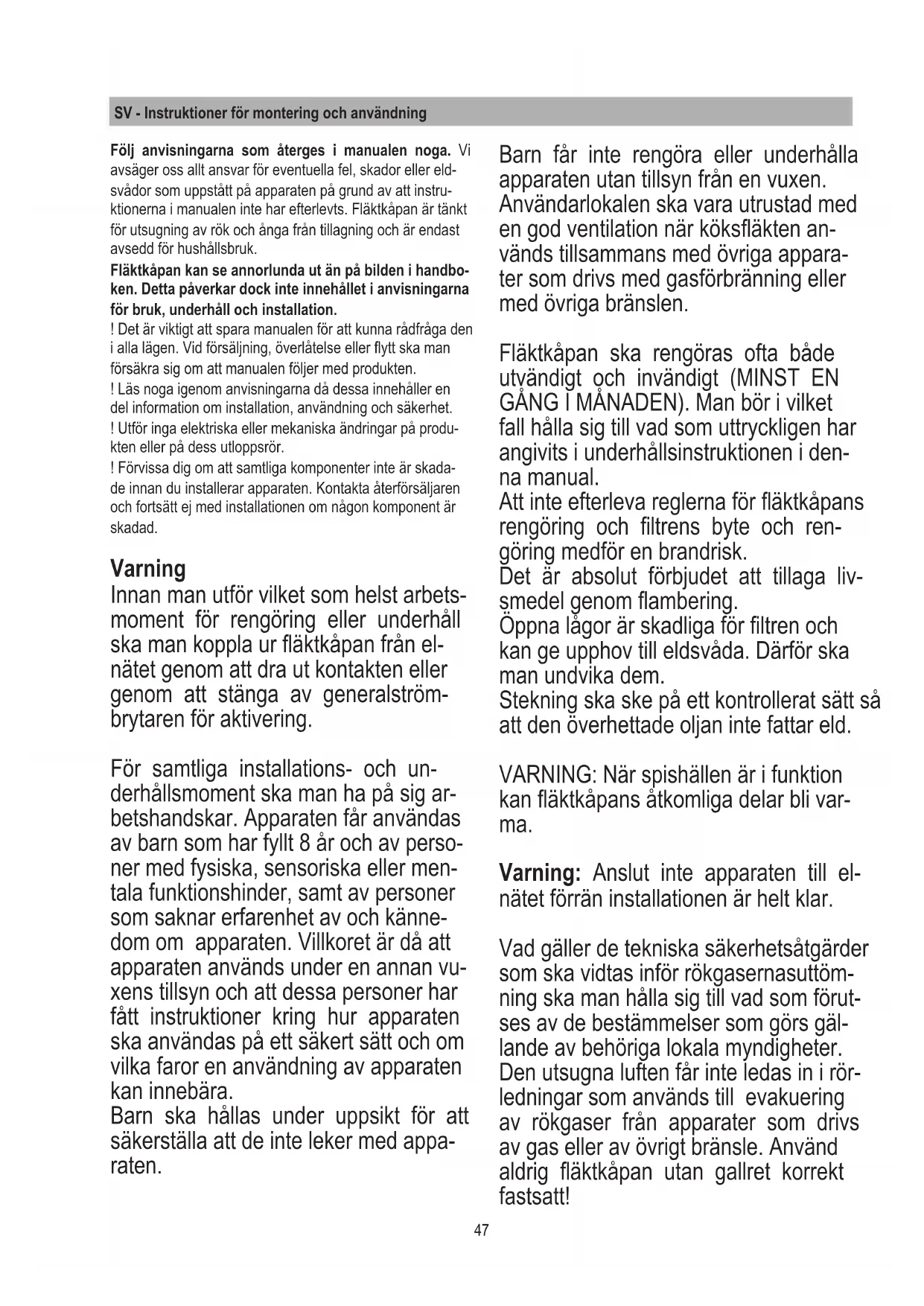 Το κλείσιμο του πάνελ πραγματοποιείται με παρόμοιο τρόπο, χρειάζεται να πιέσετε το μπροστινό γυαλί μέχρι το ολικό κλείσιμο του συρόμενου τμήματος.47 SV - Instruktioner för montering och användning Följ anvisningarna som återges i manualen noga. Vi avsäger oss allt ansvar för eventuella fel, skador eller eld- svådor som uppstått på apparaten på grund av att instru- ktionerna i manualen inte har efterlevts. Fläktkåpan är tänkt för utsugning av rök och ånga från tillagning och är endast avsedd för hushållsbruk. Fläktkåpan kan se annorlunda ut än på bilden i handbo- ken. Detta påverkar dock inte innehållet i anvisningarna för bruk, underhåll och installation. ! Det är viktigt att spara manualen för att kunna rådfråga den i alla lägen. Vid försäljning, överlåtelse eller ytt ska man försäkra sig om att manualen följer med produkten. ! Läs noga igenom anvisningarna då dessa innehåller en del information om installation, användning och säkerhet. ! Utför inga elektriska eller mekaniska ändringar på produ- kten eller på dess utloppsrör. ! Förvissa dig om att samtliga komponenter inte är skada- de innan du installerar apparaten. Kontakta återförsäljaren och fortsätt ej med installationen om någon komponent är skadad. Varning Innan man utför vilket som helst arbets- moment för rengöring eller underhåll ska man koppla ur äktkåpan från el- nätet genom att dra ut kontakten eller genom att stänga av generalström- brytaren för aktivering. För samtliga installations- och un- derhållsmoment ska man ha på sig ar- betshandskar. Apparaten får användas av barn som har fyllt 8 år och av perso- ner med fysiska, sensoriska eller men- tala funktionshinder, samt av personer som saknar erfarenhet av och känne- dom om apparaten. Villkoret är då att apparaten används under en annan vu- xens tillsyn och att dessa personer har fått instruktioner kring hur apparaten ska användas på ett säkert sätt och om vilka faror en användning av apparaten kan innebära. Barn ska hållas under uppsikt för att säkerställa att de inte leker med appa- raten. Barn får inte rengöra eller underhålla apparaten utan tillsyn från en vuxen. Användarlokalen ska vara utrustad med en god ventilation när köksäkten an- vänds tillsammans med övriga appara- ter som drivs med gasförbränning eller med övriga bränslen. Fläktkåpan ska rengöras ofta både utvändigt och invändigt (MINST EN GÅNG I MÅNADEN). Man bör i vilket fall hålla sig till vad som uttryckligen har angivits i underhållsinstruktionen i den- na manual. Att inte efterleva reglerna för äktkåpans rengöring och ltrens byte och ren- göring medför en brandrisk. Det är absolut förbjudet att tillaga liv- smedel genom ambering. Öppna lågor är skadliga för ltren och kan ge upphov till eldsvåda. Därför ska man undvika dem. Stekning ska ske på ett kontrollerat sätt så att den överhettade oljan inte fattar eld. VARNING: När spishällen är i funktion kan äktkåpans åtkomliga delar bli var- ma. Varning: Anslut inte apparaten till el- nätet förrän installationen är helt klar. Vad gäller de tekniska säkerhetsåtgärder som ska vidtas inför rökgasernasuttöm- ning ska man hålla sig till vad som förut- ses av de bestämmelser som görs gäl- lande av behöriga lokala myndigheter. Den utsugna luften får inte ledas in i rör- ledningar som används till evakuering av rökgaser från apparater som drivs av gas eller av övrigt bränsle. Använd aldrig äktkåpan utan gallret korrekt fastsatt!48 Symbolen på produkten eller på den medföljande dokumentationen indikerar att produkten inte ska betraktas som vanligt hushållsavfall. Produkten bör tas till en lämplig uppsamlingsplats för återvinning av elektrisk och elektronisk apparatur. Skaffa bort produkten genom att följa de lokala bestämmelserna för bortskaffande av avfall. För ytterligare information kring behandling, återan- vändning och återvinning av produkten ska ni kontakta lämpligt lokalkontor, tjän- sten för sophantering av hushållsavfall eller butiken där produkten inhandlades. Apparaturen har projekterats, testats och tillverkats förenligt med följande bestäm- melser:
