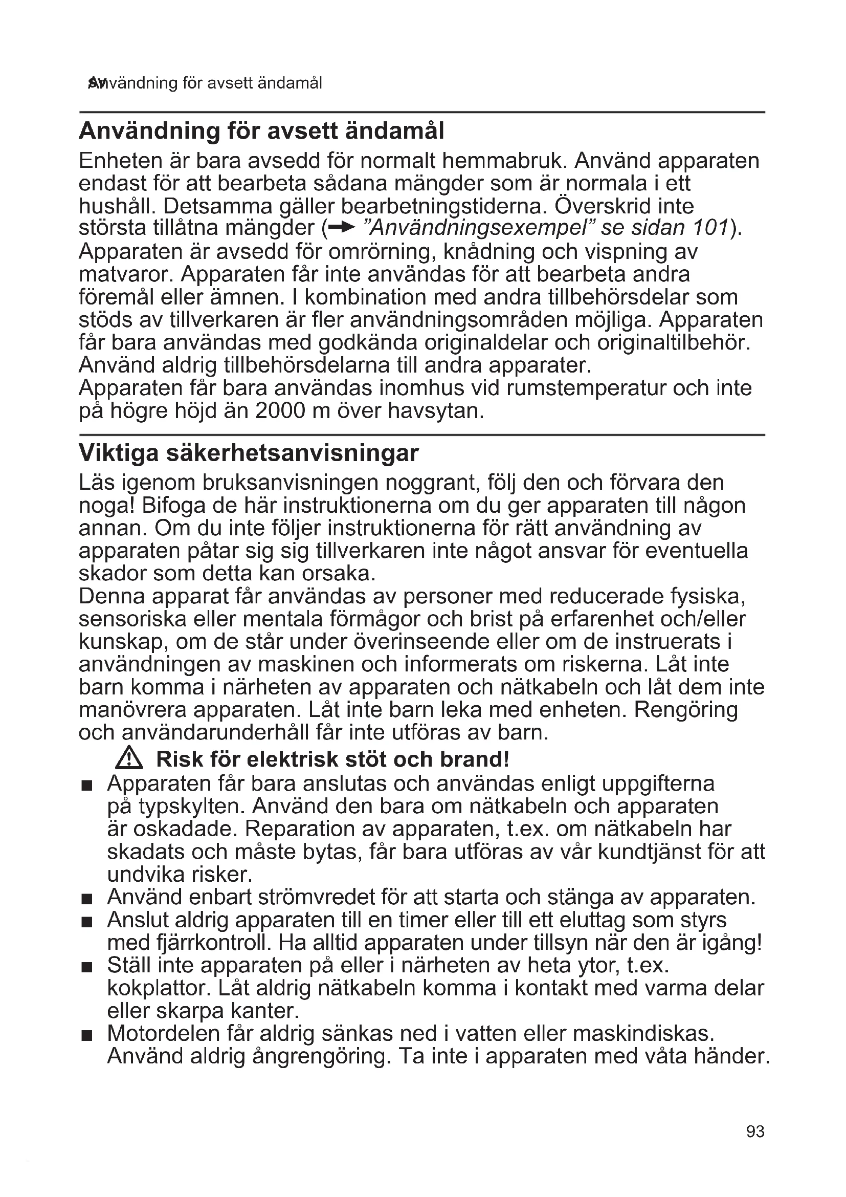 Användning för avsett ändamål Användning för avsett ändamål Enheten är bara avsedd för normalt hemmabruk. Använd apparaten endast för att bearbeta sådana mängder som är normala i ett hushåll. Detsamma gäller bearbetningstiderna. Överskrid inte största tillåtna mängder (X ”Användningsexempel” se sidan 101). Apparaten är avsedd för omrörning, knådning och vispning av matvaror. Apparaten får inte användas för att bearbeta andra föremål eller ämnen. I kombination med andra tillbehörsdelar som stöds av tillverkaren är fler användningsområden möjliga. Apparaten får bara användas med godkända originaldelar och originaltilbehör. Använd aldrig tillbehörsdelarna till andra apparater. Apparaten får bara användas inomhus vid rumstemperatur och inte på högre höjd än 2000 m över havsytan. Viktiga säkerhetsanvisningar Läs igenom bruksanvisningen noggrant, följ den och förvara den noga! Bifoga de här instruktionerna om du ger apparaten till någon annan. Om du inte följer instruktionerna för rätt användning av apparaten påtar sig sig tillverkaren inte något ansvar för eventuella skador som detta kan orsaka. Denna apparat får användas av personer med reducerade fysiska, sensoriska eller mentala förmågor och brist på erfarenhet och/eller kunskap, om de står under överinseende eller om de instruerats i användningen av maskinen och informerats om riskerna. Låt inte barn komma i närheten av apparaten och nätkabeln och låt dem inte manövrera apparaten. Låt inte barn leka med enheten. Rengöring och användarunderhåll får inte utföras av barn. W Risk för elektrisk stöt och brand! ■ Apparaten får bara anslutas och användas enligt uppgifterna på typskylten. Använd den bara om nätkabeln och apparaten är oskadade. Reparation av apparaten, t.ex. om nätkabeln har skadats och måste bytas, får bara utföras av vår kundtjänst för att undvika risker. ■ Använd enbart strömvredet för att starta och stänga av apparaten. ■ Anslut aldrig apparaten till en timer eller till ett eluttag som styrs med fjärrkontroll. Ha alltid apparaten under tillsyn när den är igång! ■ Ställ inte apparaten på eller i närheten av heta ytor, t.ex. kokplattor. Låt aldrig nätkabeln komma i kontakt med varma delar eller skarpa kanter. ■ Motordelen får aldrig sänkas ned i vatten eller maskindiskas. Använd aldrig ångrengöring. Ta inte i apparaten med våta händer.94 sv Viktiga säkerhetsanvisningar ■ Dra alltid ut nätkabeln ur uttaget efter varje användning, när du inte har apparaten under uppsikt, före hopsättning, isärtagning eller rengöring och om ett fel skulle uppkomma. W Risk för personskador! ■ Innan du byter tillbehör eller tillsatser som rör sig under användningen måste du först stänga av apparaten och dra ut nätkabeln ur uttaget. Efter avstängning fortsätter drivuttaget att rotera en kort stund. Vänta tills drivningen står helt stilla. ■ Ändra inte den ställbara funktionsarmen medan apparaten är igång. ■ Använd verktygen bara om skålen är insatt, locket är påsatt och skyddslocken över drivningarna har monterats. Sätt in skålen, locket och drivningsskydden enligt instruktionerna när du använder tillbehör! ■ Stick aldrig in handen i skålen eller påfyllningsröret när apparaten är igång. För inte in några föremål (t.ex. slevar) i skålen eller påfyllningsröret. Håll händer, hår, kläder och andra föremål borta från roterande delar. ■ Använd aldrig verktyg och tillbehör eller 2 tillbehör samtidigt. När du använder tillbehör måste du följa både den här bruksanvisningen och eventuella medföljande bruksanvisningar. ■ Använd tillbehöret bara i komplett hopsatt tillstånd. Montera aldrig ihop tillbehöret på motordelen. Använd bara tillbehöret i det avsedda arbetsläget. ■ Rör aldrig riv- och skärskivornas vassa knivar och kanter. Håll bara i kanten på riv- och skärskivorna! ■ Rör inte mixerknivarna med bara händerna. ■ Stick aldrig in fingrarna i den påsatta mixern! Använd aldrig mixern om inte locket är påsatt. ■ Var försiktig när du hanterar de vassa knivarna, när du tömmer behållaren och vid rengöringen. W Risk för brännskador. När heta ingredienser bearbetas i mixern tränger ånga ut genom tratten i locket. Fyll på högst 0,5 liter het eller skummande vätska. W Risk för kvävning! Låt inte barn leka med förpackningsmaterialet. W Varning! Vi rekommenderar dig att inte låta apparaten vara igång längre tid än vad som behövs för att bearbeta matvarorna. Låt inte apparaten gå på tomgång.95