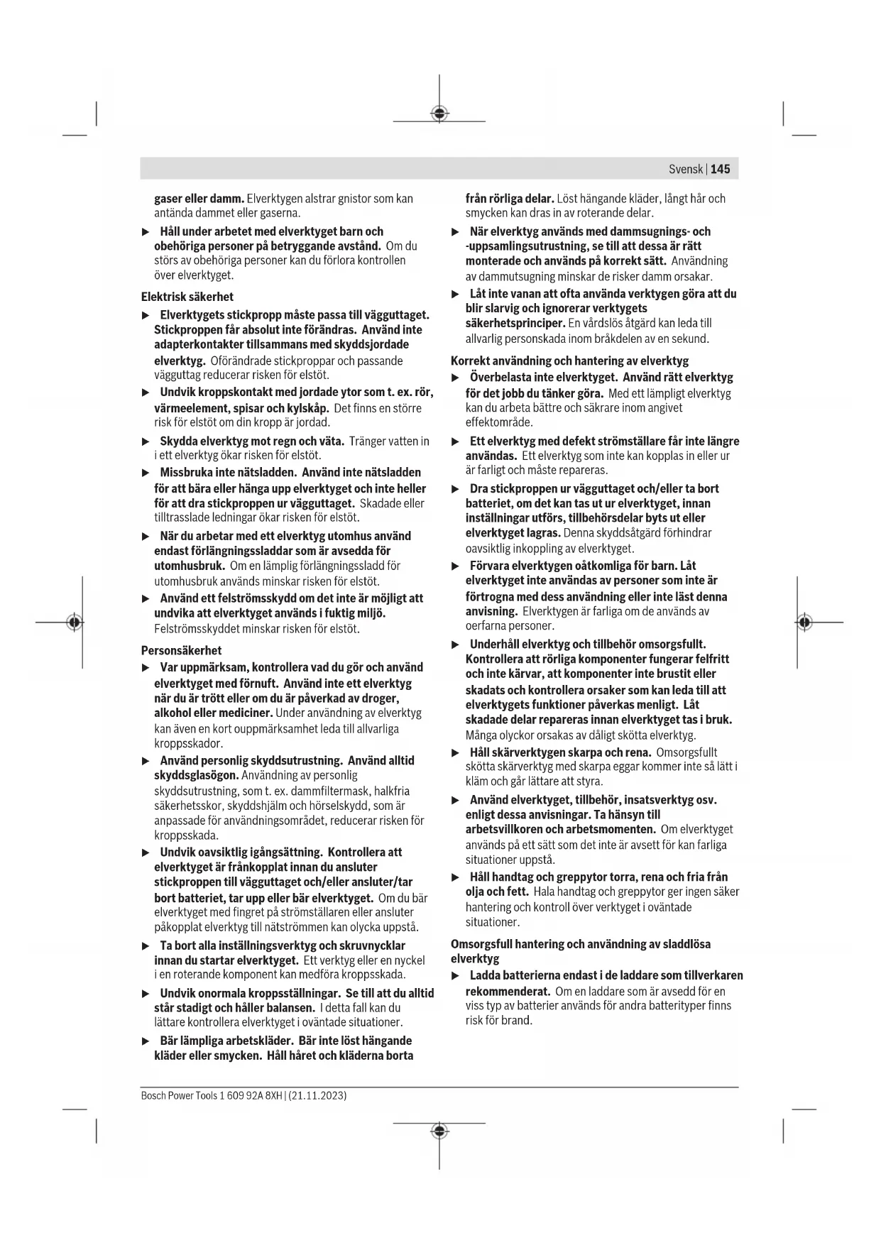 125 21 – 22,2 – 11000 80 Vrid växellådshuvudet (se bildF) u Ta bort batteriet ur elverktyget innan åtgärder utförs på elverktyget (t.ex. underhåll, verktygsbyte) samt före transport och lagring. Om strömställaren Till/Från oavsiktligt påverkas finns risk för personskada. Du kan vrida växelhuvudet i steg om 90°. Då kan på-/av- strömbrytaren placeras i en bättre hanteringsposition vid speciella arbetsfall, t.ex. för vänsterhänta personer. Skruva ut de 4 skruvarna helt och hållet(➊). Sväng växelhuvudet försiktigt och utan att ta av det från kåpan till den nya positionen(➋). Dra åt de 4 skruvarna igen(➌). Damm-/spånutsugning Dammet från material som t.ex. blyhaltig målning, vissa träslag, mineraler och metall kan vara hälsovådligt. Beröring eller inandning av dammet kan orsaka allergiska reaktioner och/eller andningsbesvär hos användaren eller personer som uppehåller sig i närheten. Vissa damm från ek eller bok anses vara cancerogena, speciellt då i förbindelse med tillsatsämnen för träbehandling (kromat, träkonserveringsmedel). Endast yrkesmän får bearbeta asbesthaltigt material. – Se till att arbetsplatsen är väl ventilerad. – Vi rekommenderar ett andningsskydd i filterklass P2. 1 609 92A 8XH | (21.11.2023) Bosch Power ToolsSvensk | 157 Beakta de föreskrifter som i aktuellt land gäller för bearbetat material. u Undvik dammanhopning på arbetsplatsen. Damm kan lätt självantändas. Drift u Belasta inte elverktyget så mycket att det stannar. u Ta bort batteriet ur elverktyget innan åtgärder utförs på elverktyget (t.ex. underhåll, verktygsbyte) samt före transport och lagring. Om strömställaren Till/Från oavsiktligt påverkas finns risk för personskada. u Var försiktig vid spårning i bärande väggar. Se avsnittet "Information om statiken". u Spänn upp arbetsstycket, såvida det inte ligger säkert på grund av sin egenvikt. u Om elverktyget använts under hög belastning, låt det gå några minuter på tomgång för avkylning av tillsatsverktyget. u Elverktyget får inte användas med ett kapbord. u Rör inte slip- och kapskivorna innan de svalnat. Skivorna blir mycket heta vid arbetet. Arbetsanvisningar Skrubbning u Använd alltid skyddskåpa för slipning (14)vid skrubbslipning med bundna slipmedel. u Använd aldrig kapskivor för skrubbning. u Vid skrubbslipning kan skyddskåpan för kapning (15) eller skyddskåpan för slipning (14) med monterat lock för kapning (16) stöta mot arbetsstycket vilket leder till förlust av kontrollen över verktyget. Med en ställvinkel på 30° till 40° får du det bästa resultatet vid skrubbning. Flytta elverktyget med måttfullt tryck fram och tillbaka. Då blir materialet inte för varmt, missfärgas inte, och det blir inga repor. u Vid användning av bundna skivor som är tillåtna både för kapning och slipning måste skyddshuven för kapning (15) resp. skyddshuven för slipning (14) med monterat lock för kapning (16) användas. Ytslipning med solfjäderslipskiva u Använd alltid skyddskåpa för slipning (14) vid slipning med solfjäderslipskiva. Med solfjäderslipskivan (tillbehör) kan också välvda ytor och profiler bearbetas. Solfjädersslipskivor har en avsevärt längre livslängd, lägre bullernivå och lägre sliptemperaturer än konventionella slipskivor. Ytslipning med sliprondell u Montera alltid handskyddet(23) vid arbeten med gummisliptallriken (24). Slipning med sliprondell kan göras utan skyddskåpa. Monteringens ordningsföljd framgår av grafiksidan. Skruva fast rundmuttern(28) och spänn den med tvåstiftsnyckeln. Koppborste/skivborste/konformad borste u Använd alltid skyddskåpan för slipning (14) vid borstning med skivborste. Borstning med koppborste/konformad borste kan göras utan skyddskåpa. u Montera alltid handskyddet (23) med koppborste eller konformad borste. u Borsten på skivborsten kan fastna i skyddskåpan och gå av om max. tillåtna mått för skivborstarna överskrids. Monteringens ordningsföljd framgår av grafiksidan. Koppborsten/den konformade borsten/skivborsten ska gå att skruva så långt på slipspindeln så att den ligger an fast mot slipspindelflänsen i slutet av slipspindelgängningen. Spänn fast koppborsten/den konformade borsten/ skivborsten med en gaffelnyckel. För att fästa skivborsten med diameter 22,22mm sätter du fästflänsen med O-ringen (17) på slipspindeln (22), skruvar på rundmuttern (28) och drar åt den med tvåstiftsnyckeln. Kapning av metall u Vid kapning av metall med bundna kapskivor eller med diamant-kapskivor, använd alltid skyddskåpan för kapning (15) resp. skyddskåpan för slipning (14) med monterat lock för kapning (16). u Vid användning av skyddskåpan för slipning (14) för kapning med bundna kapskivor föreligger en ökad risk för gnistor och partiklar samt skivfragment vid skivbrott. Arbeta med måttfull frammatning vid kapning, som är anpassad till materialet. Utöva inget tryck på kapningsskivan och förvrid och oscillera den inte. Bromsa inte in den utgående kapningsskivan genom att trycka emot på sidan. Elverktyget måste alltid föras med motrotation. Annars föreligger risk för att den trycks ut ur kapningen okontrollerat. Vid kapning av profiler och fyrkantsrör är det bäst att sätta an där diametern är som minst. Kapning av sten u Vid kapning av sten med bundna kapskivor eller med diamantkapskivor, använd alltid utsugskåpan för kapning med styrsläde (32) eller skyddskåpa för kapning (15) eller skyddskåpan för slipning (14) med monterat lock för kapning (16). u Vid kapning i sten bör en tillräckligt god dammutsugning anordnas. u Bär dammskyddsmask. u Elverkyget får endast användas för torrkapning/ torrslipning. u Vid användning av skyddskåpan för kapning (15), skyddskåpan för slipning (14) eller skyddskåpan för slipning (14) med monterat lock för kapning (16) vid Bosch Power Tools 1 609 92A 8XH | (21.11.2023)158 | Svensk kapning oc